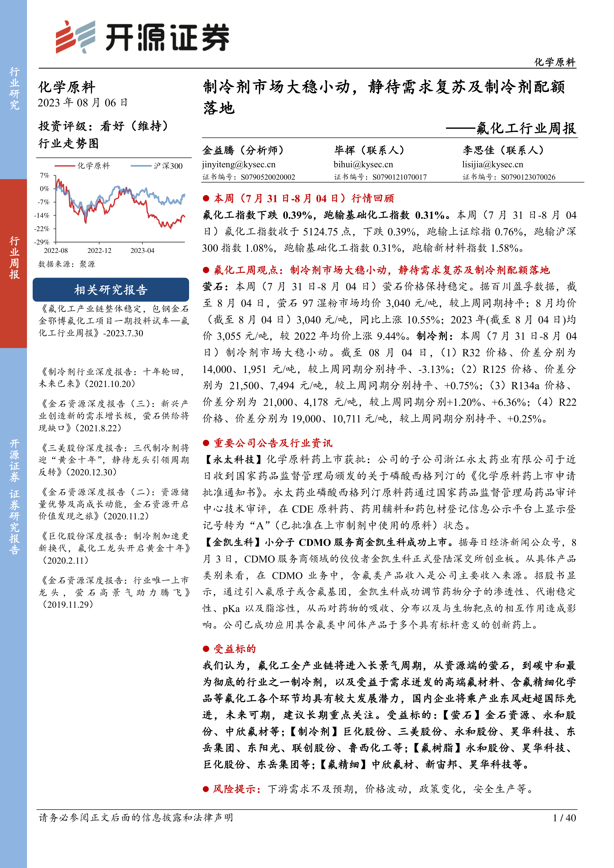 本报告的核心观点是氟化工行业整体市场表现大稳小动,静待需求复苏和制冷剂配额落地。具体而言: