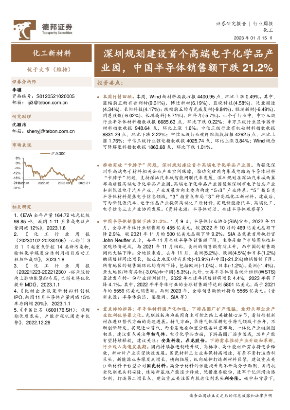 化工行业周报:深圳规划建设首个高端电子化学品产业园,中国半导体销售额下跌21.2%