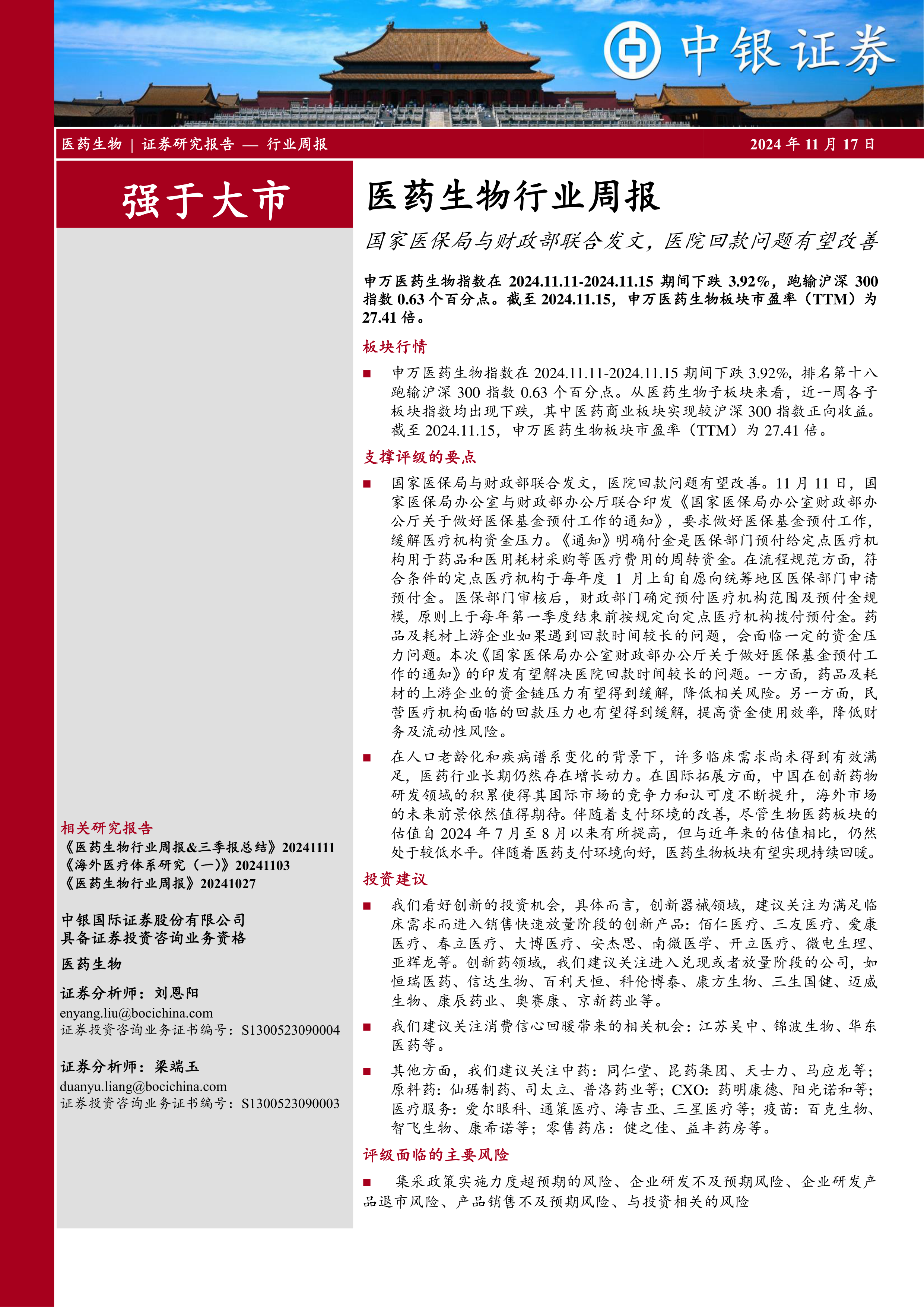 申万医药生物指数在2024.11.11-2024.11.15期间下跌3.92%,跑输沪深300指数0.63个百分点。截至2024.11.15,申万医药生物板块市盈率(TTM)为27.41倍。