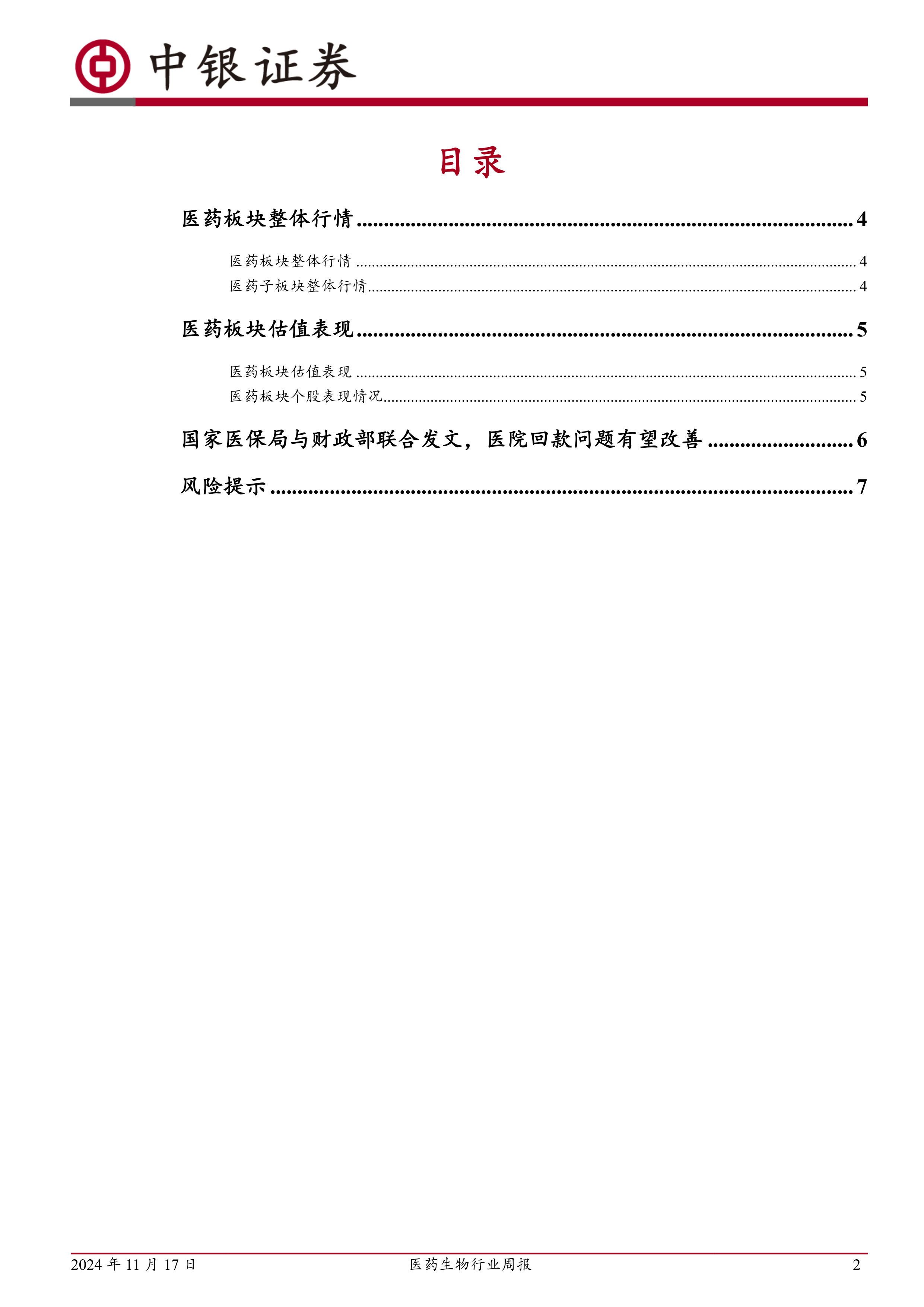 本报告的核心观点是:尽管申万医药生物指数近期下跌,跑输沪深300指数,但国家医保局与财政部联合发文改善医院回款问题,为医药行业带来利好,长期增长动力依然存在,板块有望持续回暖。报告建议关注创新器械、创新药、消费信心回暖相关的公司以及中药、原料药、CXO、医疗服务、疫苗和零售药店等领域。