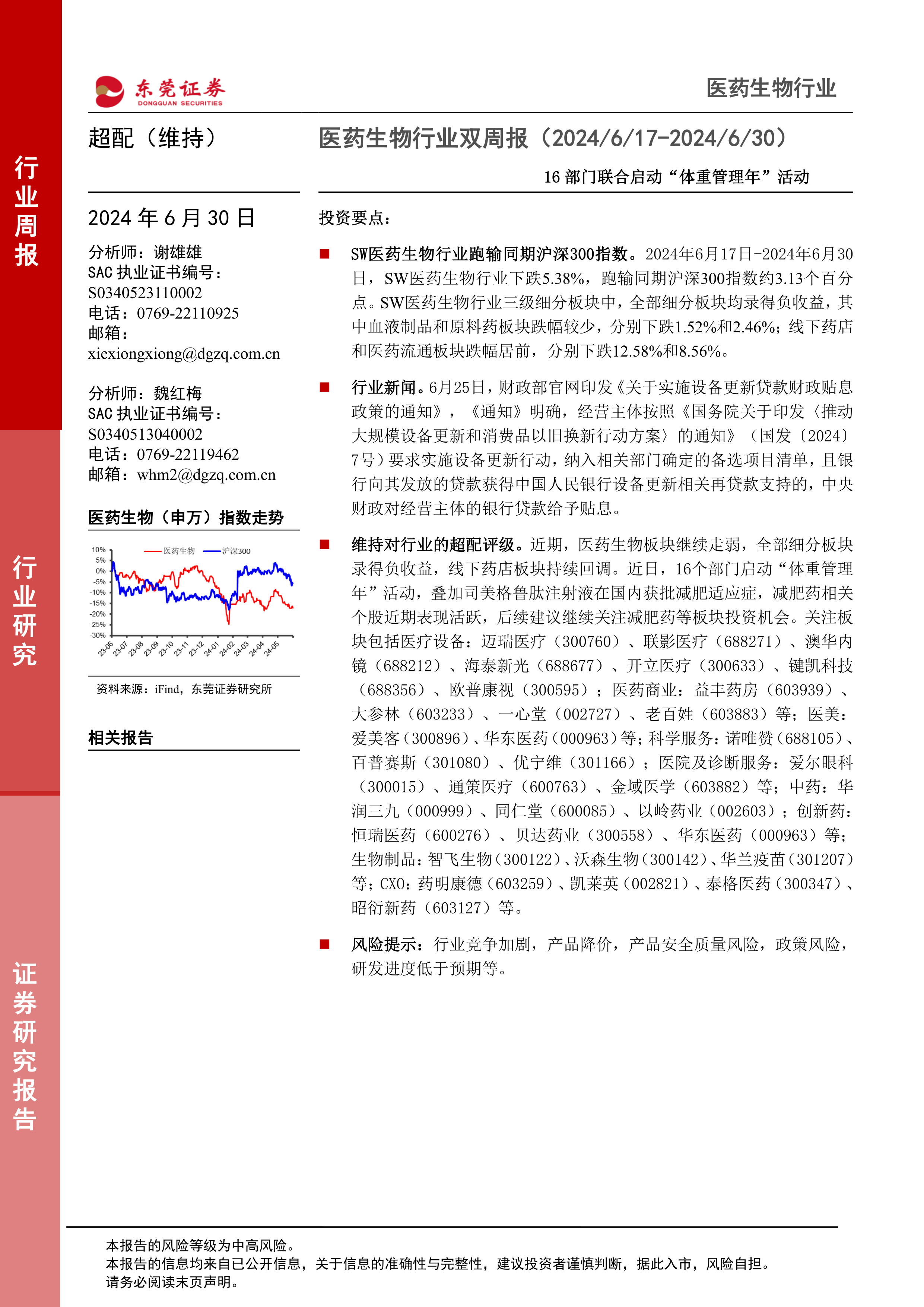 本报告对2024年6月17日至2024年6月30日期间SW医药生物行业的表现进行了全面分析。尽管行业整体表现疲软,所有细分板块均录得负收益,但报告仍维持超配评级,并指出“体重管理年”活动和司美格鲁肽获批减肥适应症等因素可能带来新的投资机会,建议关注减肥药及相关板块。报告同时详细分析了行业重要新闻、上市公司公告,并列出了潜在的风险因素,为投资者提供参考。 投资者需注意,本报告仅供参考,不构成投资建议,投资需谨慎。