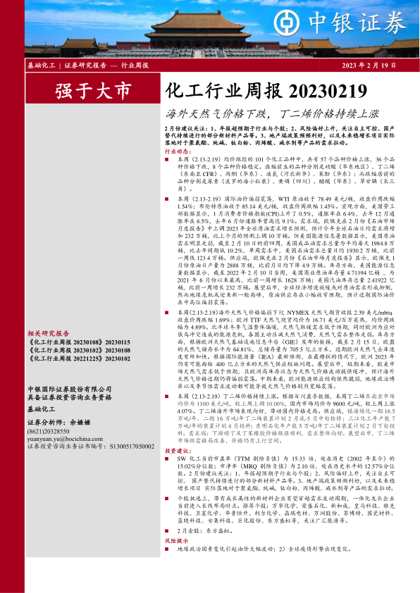 化工行业周报:海外天然气价格下跌,丁二烯价格持续上涨