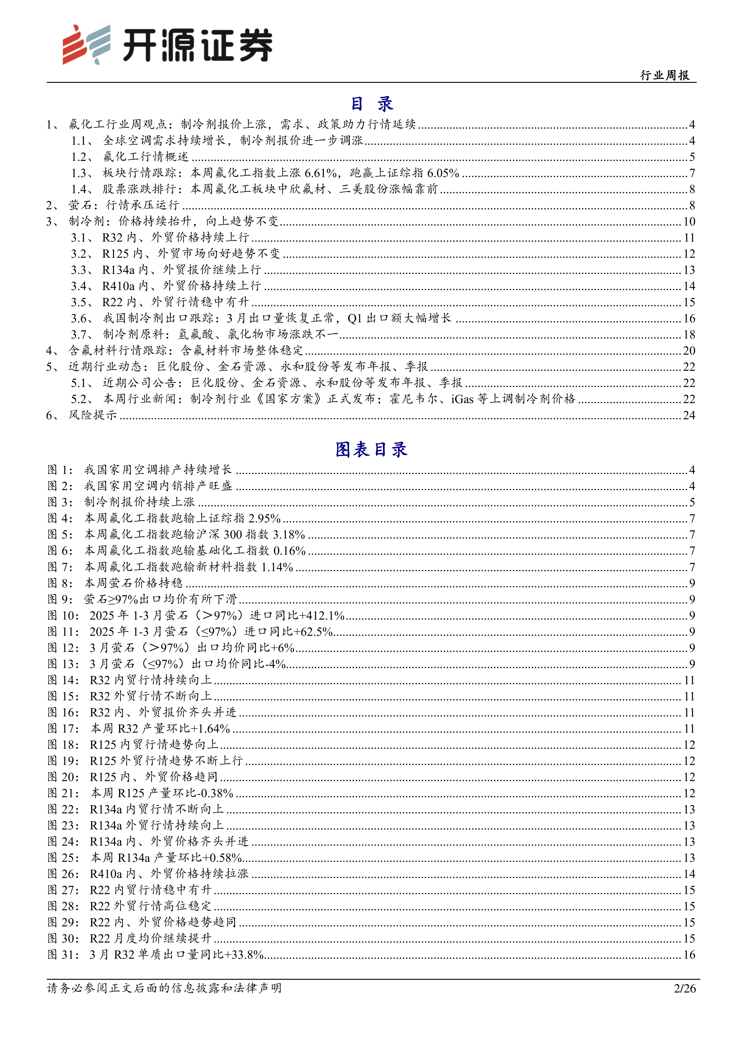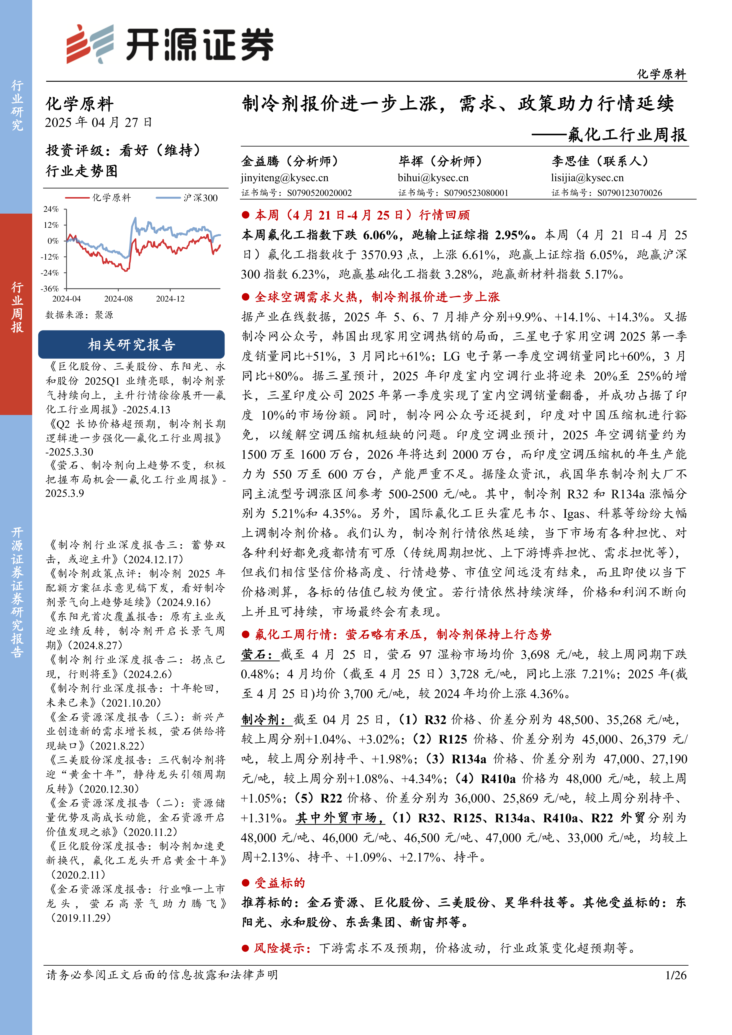 据产业在线数据,2025年5、6、7月排产分别+9.9%、+14.1%、+14.3%。又据制冷网公众号,韩国出现家用空调热销的局面,三星电子家用空调2025第一季度销量同比+51%,3月同比+61%;LG电子第一季度空调销量同比+60%,3月同比+80%。据三星预计,2025年印度室内空调行业将迎来20%至25%的增长,三星印度公司2025年第一季度实现了室内空调销量翻番,并成功占据了印度10%的市场份额。同时,制冷网公众号还提到,印度对中国压缩机进行豁免,以缓解空调压缩机短缺的问题。印度空调业预计,2025年空调销量约为1500万至1600万台,2026年将达到2000万台,而印度空调压缩机的年生产能力为550万至600万台,产能严重不足。据隆众资讯,我国华东制冷剂大厂不同主流型号调涨区间参考500-2500元/吨。其中,制冷剂R32和R134a涨幅分别为5.21%和4.35%。另外,国际氟化工巨头霍尼韦尔、Igas、科慕等纷纷大幅上调制冷剂价格。我们认为,制冷剂行情依然延续,当下市场有各种担忧、对各种利好都免疫都情有可原(传统周期担忧、上下游博弈担忧、需求担忧等),但我们相信坚信价格高度、行情趋势、市值空间远没有结束,而且即使以当下价格测算,各标的估值已较为便宜。若行情依然持续演绎,价格和利润不断向上并且可持续,市场最终会有表现。