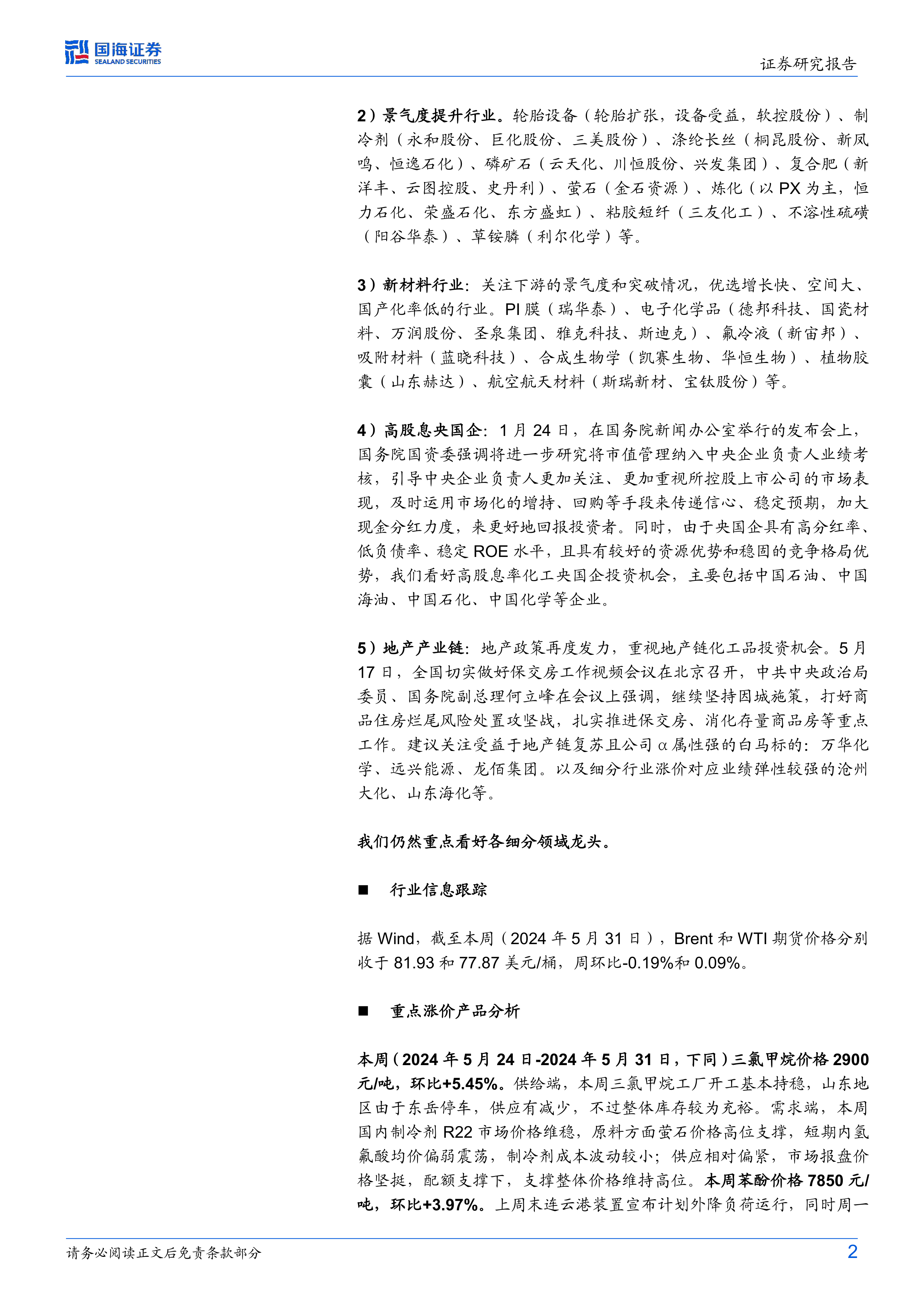 本周( 2024 年 5 月 24 日-2024 年 5 月 31 日, 下同) 三氯甲烷价格 2900元/吨, 环比+5.45%。 供给端, 本周三氯甲烷工厂开工基本持稳, 山东地区由于东岳停车, 供应有减少, 不过整体库存较为充裕。 需求端, 本周国内制冷剂 R22 市场价格维稳, 原料方面萤石价格高位支撑, 短期内氢氟酸均价偏弱震荡, 制冷剂成本波动较小; 供应相对偏紧, 市场报盘价格坚挺, 配额支撑下, 支撑整体价格维持高位。 本周苯酚价格 7850 元/吨, 环比+3.97%。 上周末连云港装置宣布计划外降负荷运行, 同时周一纯苯价格挂牌补涨, 酚酮工厂成本面抬升, 制约产品降幅。 并且下游双酚 A 负荷开始回升, 沧州工厂在周二下午投料; 综上供应端、 成本段、需求段均出利好扭转了下行走势。 本周顺丁橡胶价格 13800 元/吨, 环比+3.76%。 成本端, 本周丁二烯市场价格延续涨势。 供给端, 顺丁橡胶独山子石化、 山东威特、 振华新材料、 辽宁胜友、 山东益华、 菏泽科信装置停车, 扬子石化、 齐鲁石化装置降负荷运行。 供应端利好指引稳定。