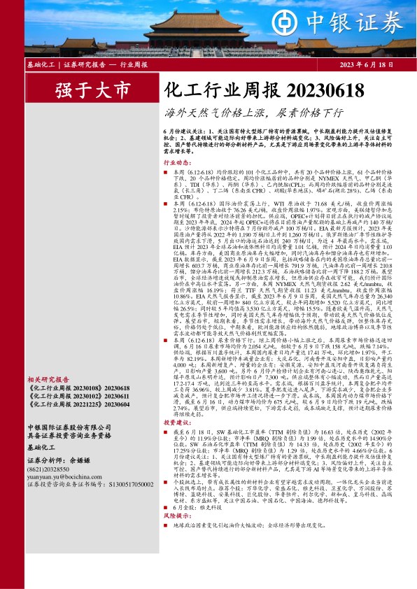 本周(6.12-6.18)国际油价震荡上行,WTI原油收于71.68美元/桶,收盘价周涨幅2.15%;布伦特原油收于76.26美元/桶,收盘价周涨幅1.97%。宏观方面,美联储暂停加息暂时缓解了投资者对经济前景的担忧。供应端,OPEC+计划将目前正在执行的减产协议延期至2023年年底,2024年起OPEC+还将在目前原油产量配额的基础上再减产约140万桶/日。沙特能源部表示沙特将在7月份额外减产100万桶/日。EIA最新月报预计,2023年美国原油产量将从2022年的1,190万桶/日上升到1,260万桶/日。俄罗斯炼油厂季节性维护导致国内需求下滑,5月出口的海运石油达到240万桶/日,为近4年最高水平。需求端,EIA预计2023年全球石油和液体燃料日均消费量1.01亿桶,预计2024年日均消费量1.03亿桶。库存方面,美国商业原油库存大幅增加,同时汽油库存和馏分油库存也有所增加。EIA数据显示,截至2023年6月9日当周,包括战略储备在内的美国原油库存总量比前一周增长603.7万桶,商业原油库存比前一周增长791.9万桶,汽油库存比前一周增长210.8万桶,馏分油库存比前一周增长212.3万桶,石油战略储备比前一周下降188.2万桶。展望后市,全球经济增速放缓或抑制原油需求增长,但原油供应存在收窄可能,我们预计国际油价在中高位水平震荡。另一方面,本周NYMEX天然气期货收报2.62美元/mmbtu,收盘价周涨幅16.19%;荷兰TTF天然气期货收报11.23美元/mmbtu,收盘价周涨幅10.86%。EIA天然气报告显示,截至2023年6月9日当周,美国天然气库存总量为26,340亿立方英尺,较前一周增加840亿立方英尺,较去年同期增加5,520亿立方英尺,同比增幅26.5%;同时较5年均值高3,530亿立方英尺,增幅15.5%。随着欧美气温升高,天然气发电需求季节性增加,同时美国天然气库存增幅低于预期,带动欧美天然气价格低位反弹。展望后市,短期来看,季节性需求增长,带动海外天然气价格反弹,但整体库存充裕,价格仍处于低位,中期来看,欧洲能源供应结构依然脆弱,地缘政治博弈以及季节性需求波动都可能导致天然气价格剧烈宽幅震荡。