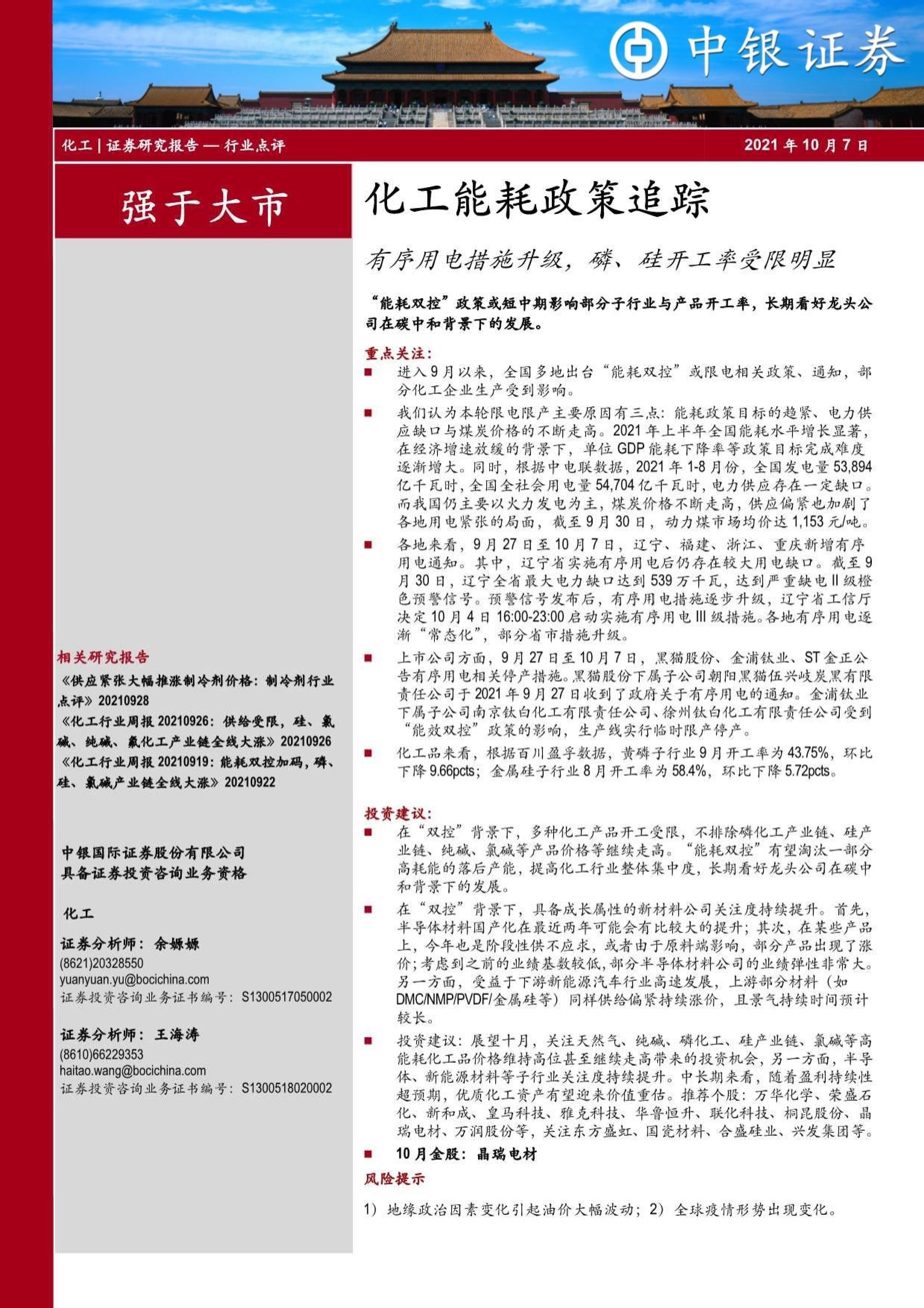 在“双控”背景下,多种化工产品开工受限,不排除磷化工产业链、硅产业链、纯碱、气碱等产品价格等继续走高。“能耗双控”有望淘汰一部分高耗能的落后产能,提高化工行业整体集中度,长期看好龙头公司在碳中和背景下的发展。