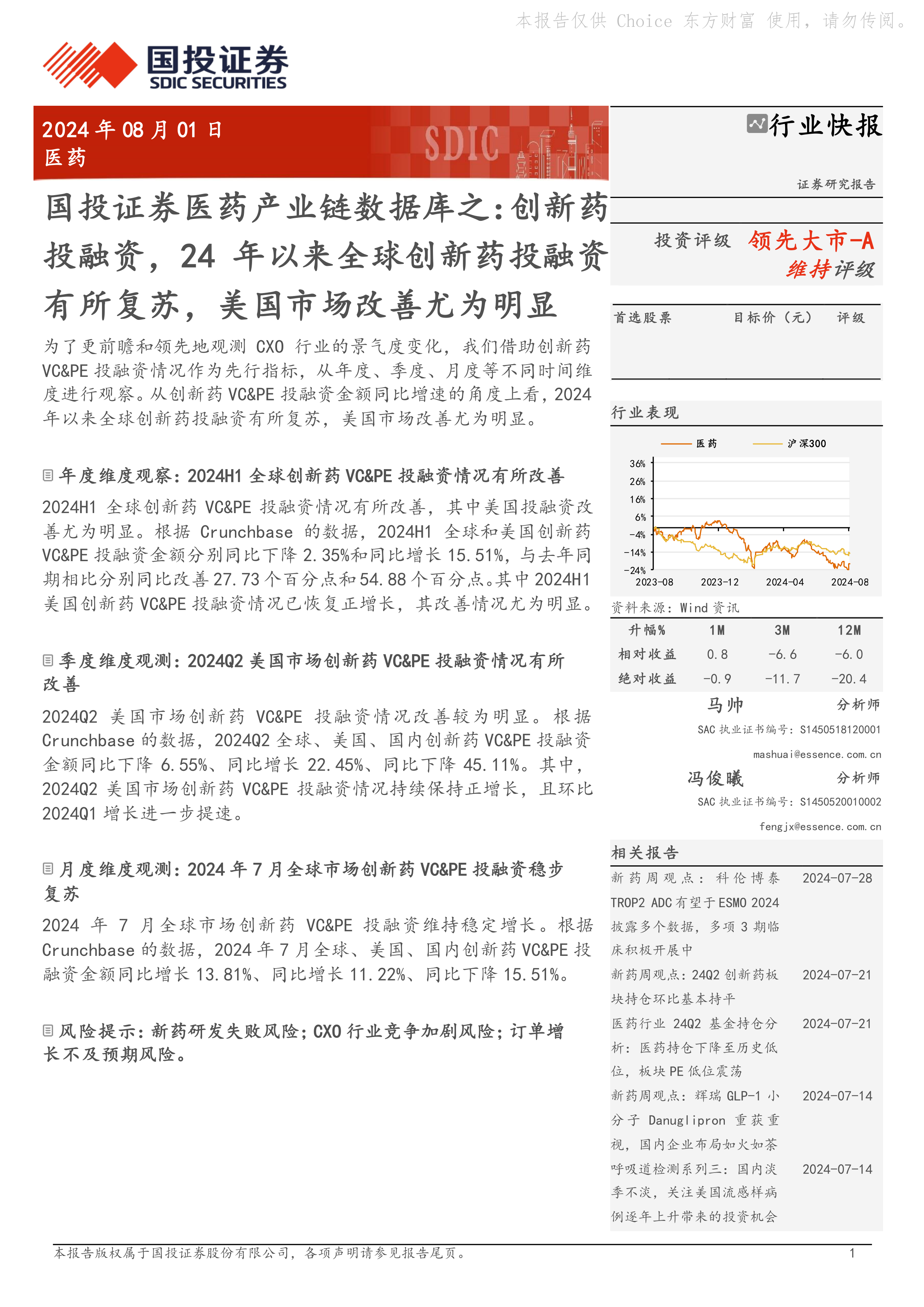 本报告的核心观点是:2024年以来,全球创新药投融资市场出现复苏迹象,美国市场表现尤为突出。这一趋势可以通过年度、季度和月度数据进行佐证,为CXO行业景气度变化提供了先行指标。然而,报告也指出了新药研发失败、行业竞争加剧以及订单增长不及预期等风险。