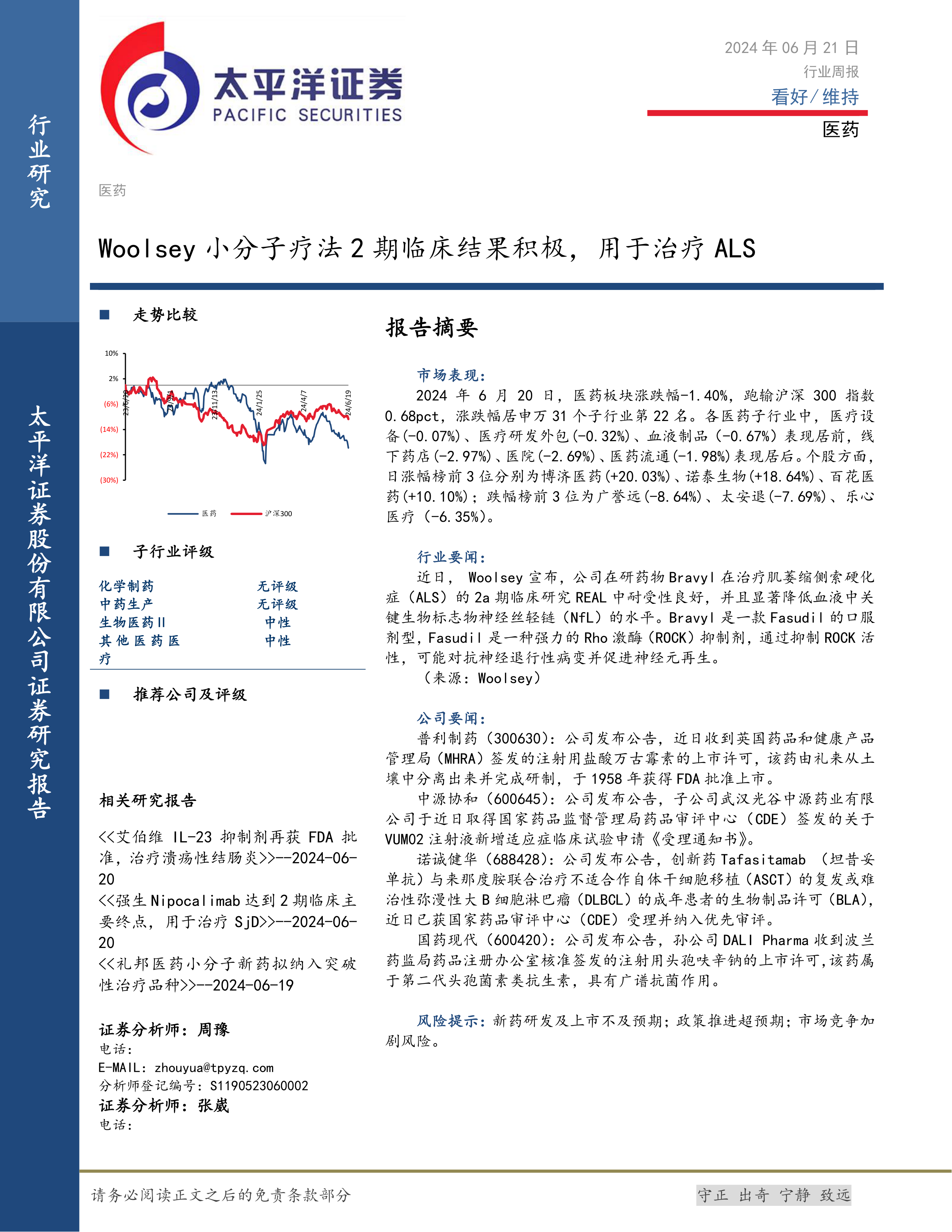 本报告对2024年6月21日医药行业周报进行了分析,指出行业整体表现分化,部分细分领域和个股表现亮眼,但整体面临诸多挑战。Woolsey公司在研药物的积极临床结果为ALS治疗领域带来希望,而其他公司在药品上市许可和临床试验申请方面的进展也体现了行业持续发展的潜力。然而,新药研发风险、政策变化以及市场竞争加剧等因素仍需密切关注。投资者需谨慎评估风险,结合自身投资策略进行决策。 未来,持续关注新药研发进展、政策变化以及市场竞争态势,将有助于更准确地把握医药行业投资机会。