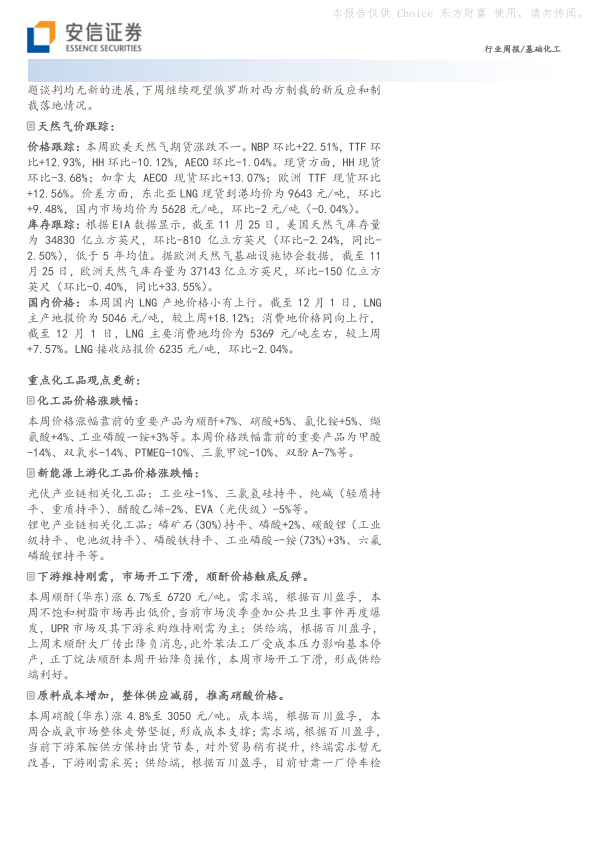 本报告对2022年12月4日一周的基础化工行业进行了全面分析。报告指出,国际油价上涨是本周影响基础化工行业的主要因素,导致部分化工产品价格上涨。然而,整体化工品价格指数下跌,部分产品价格下跌,市场存在一定风险。报告对主要化工产品的价格波动进行了详细分析,并从成本、需求和供给三个方面解释了价格变化的原因。此外,报告还对天然气市场和新能源上游化工品市场进行了分析,并提出了相应的投资建议。 投资者需关注原料价格波动、下游需求不及预期等风险。 报告信息仅供参考,不构成投资建议。