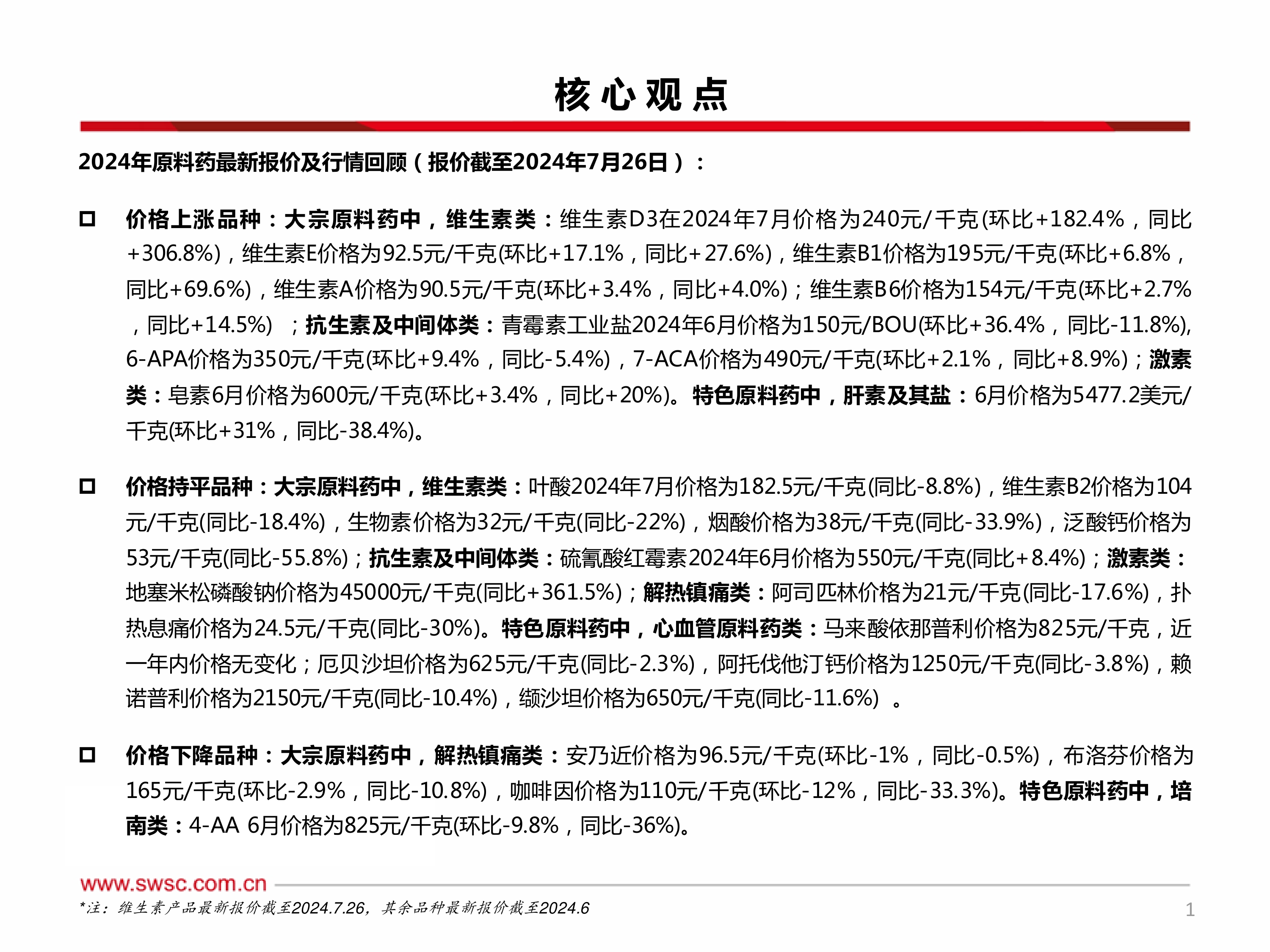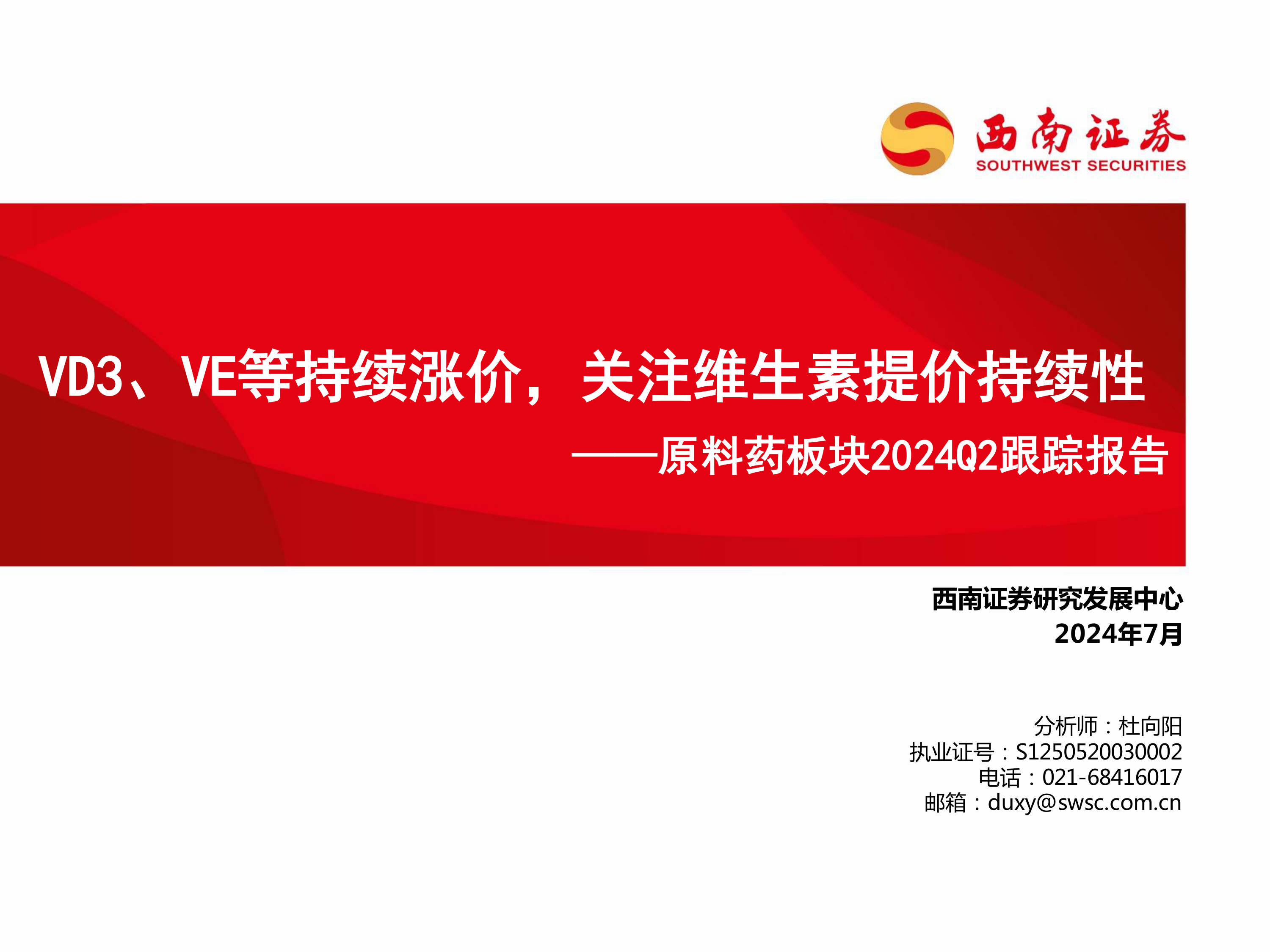 原料药板块2024Q2跟踪报告:VD3、VE等持续涨价,关注维生素提价持续性