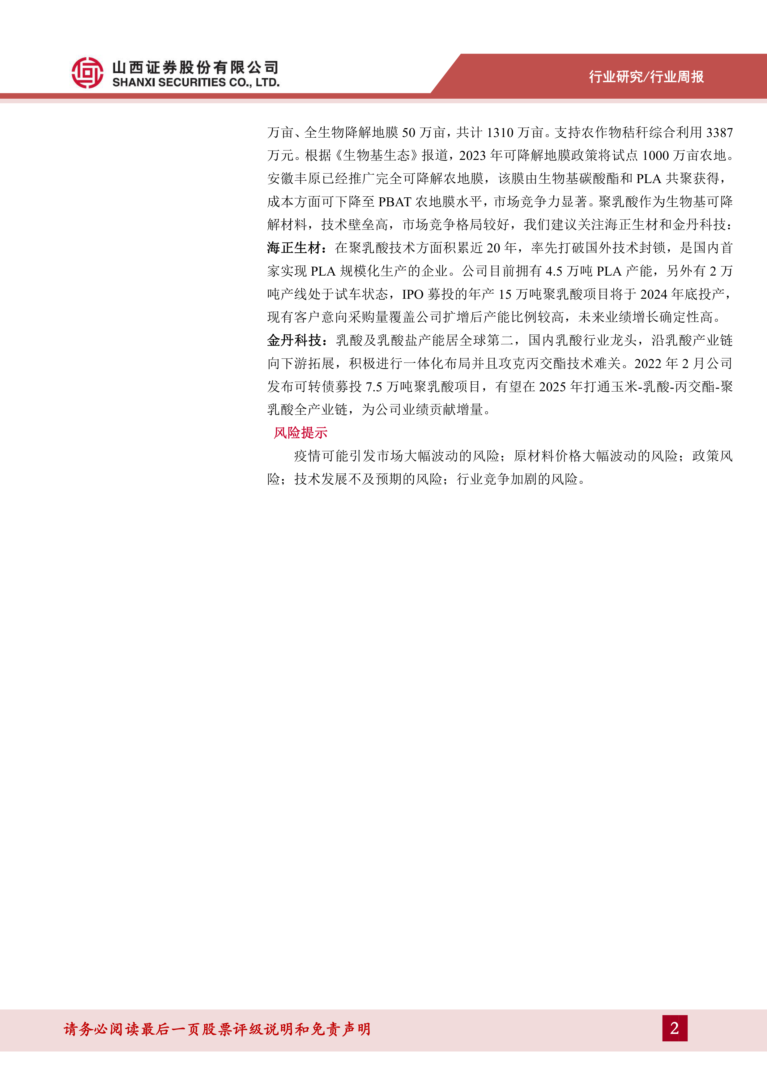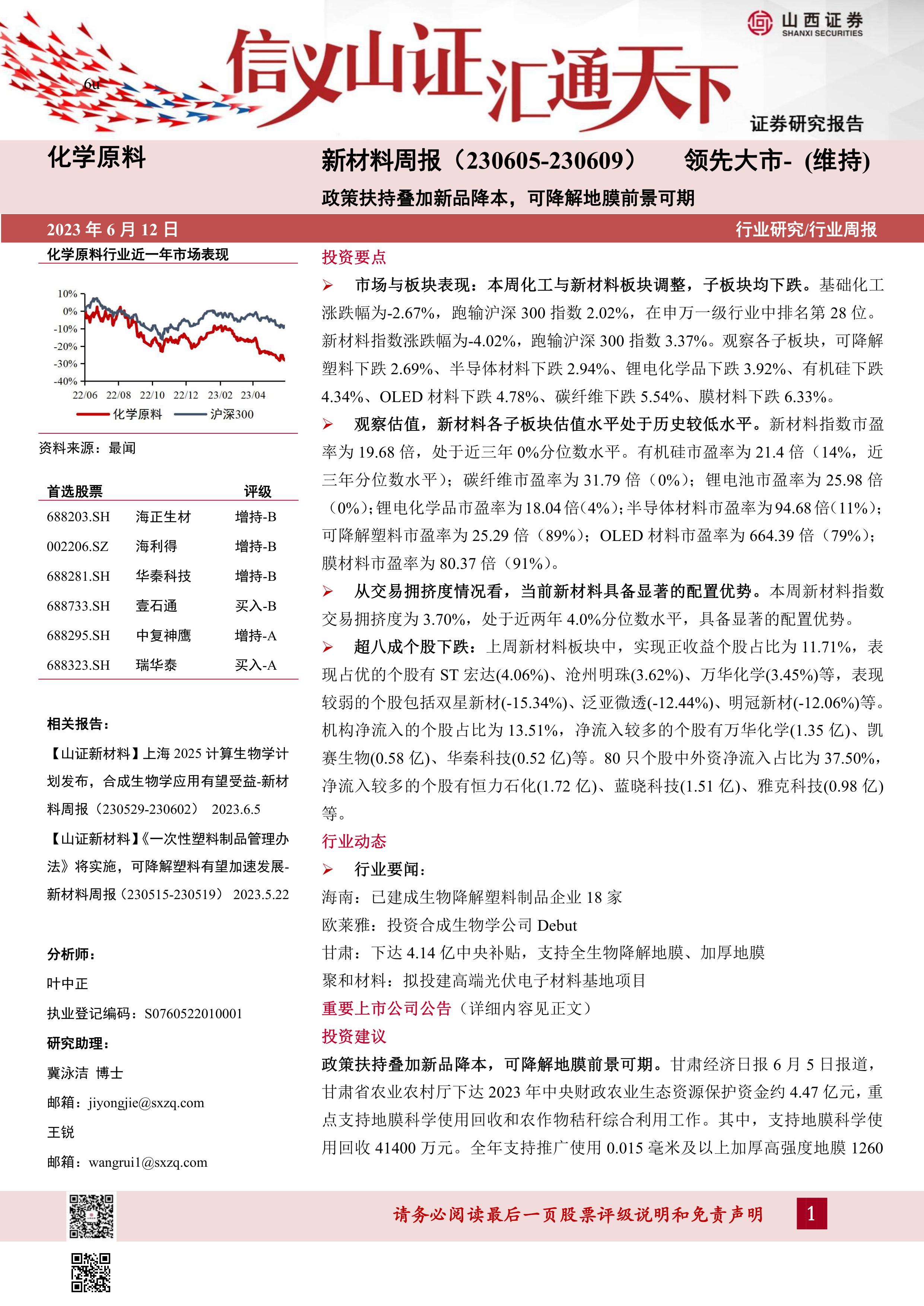 报告从长期和短期两个维度阐述了对新材料行业的观点。长期来看,新材料行业发展潜力巨大,投资逻辑清晰;短期来看,可降解地膜由于政策扶持和成本下降,发展前景良好,值得重点关注。报告特别推荐了海正生材和金丹科技两家公司。