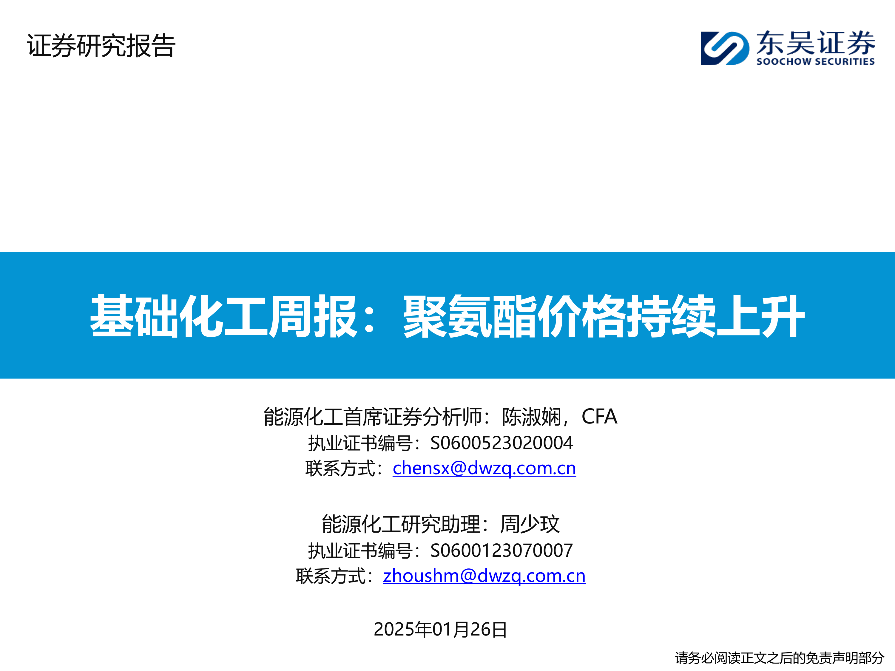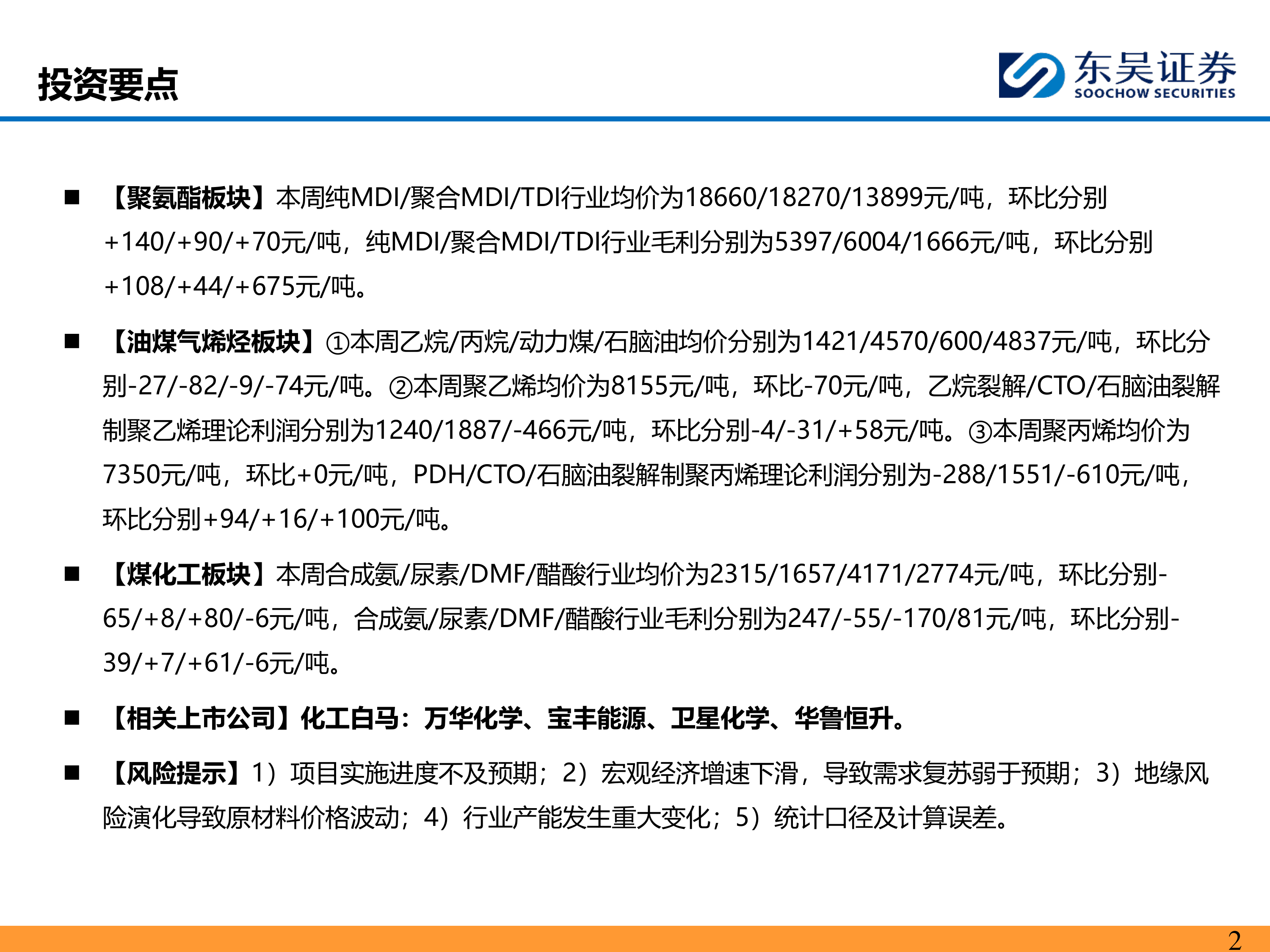 本报告的核心观点是:本周基础化工市场呈现分化态势。聚氨酯板块价格持续上涨,盈利能力显著提升;油煤气烯烃板块价格波动较大,盈利能力受原材料价格影响显著;煤化工板块价格涨跌互现,盈利能力整体较为平稳。