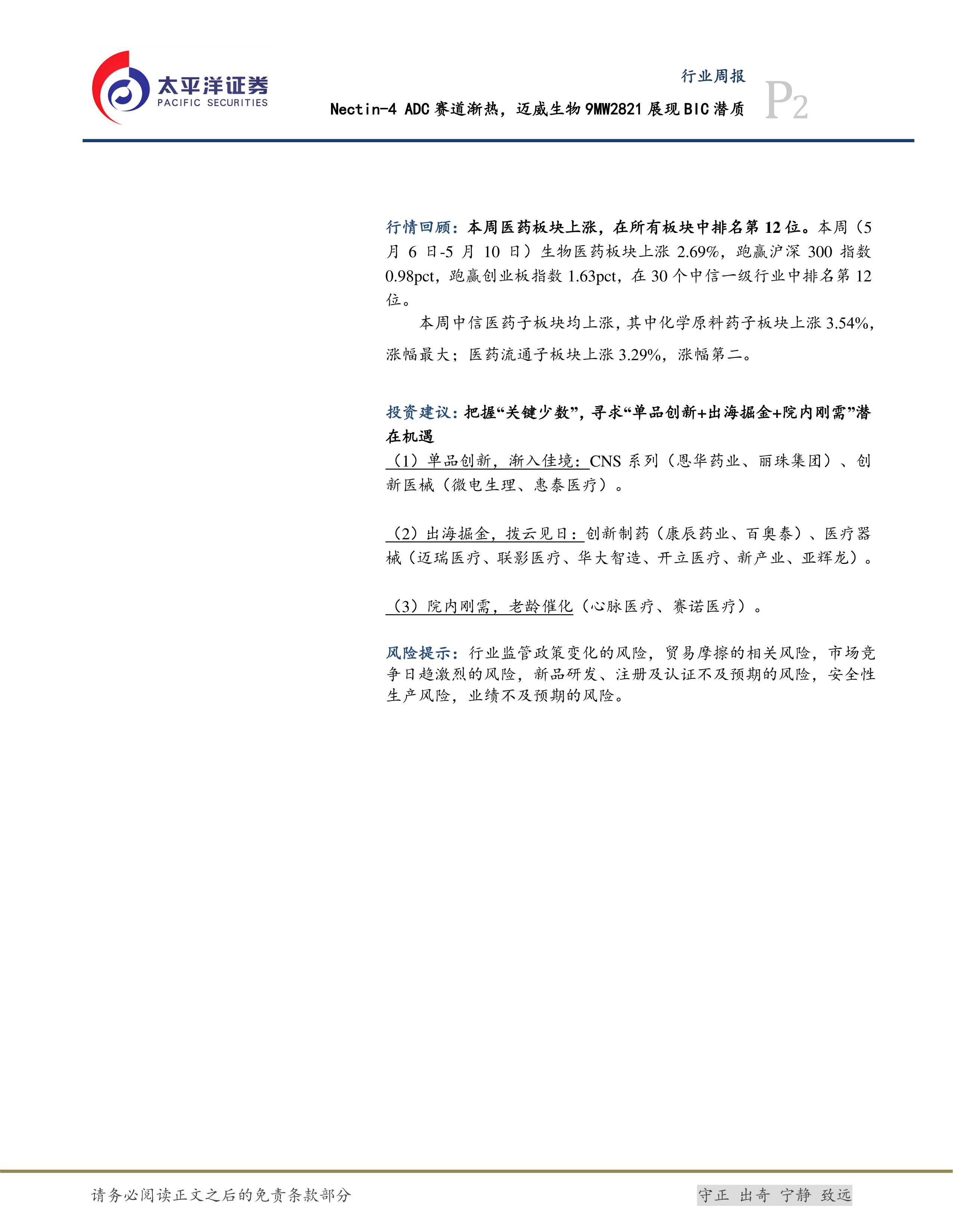 报告最后提出了对医药行业未来发展趋势的展望,并给出了具体的投资建议。 报告认为,创新仍是医药领域重要的投资主线,并推荐了多个值得关注的投资标的,包括研发Nectin-4 ADC的企业(迈威生物、科伦博泰、百奥泰)以及相关的CRO(药明合联)。 报告还分析了本周医药板块的行情,包括板块整体走势、子板块涨跌幅、估值变化以及北向资金和南向资金的持仓变化等。