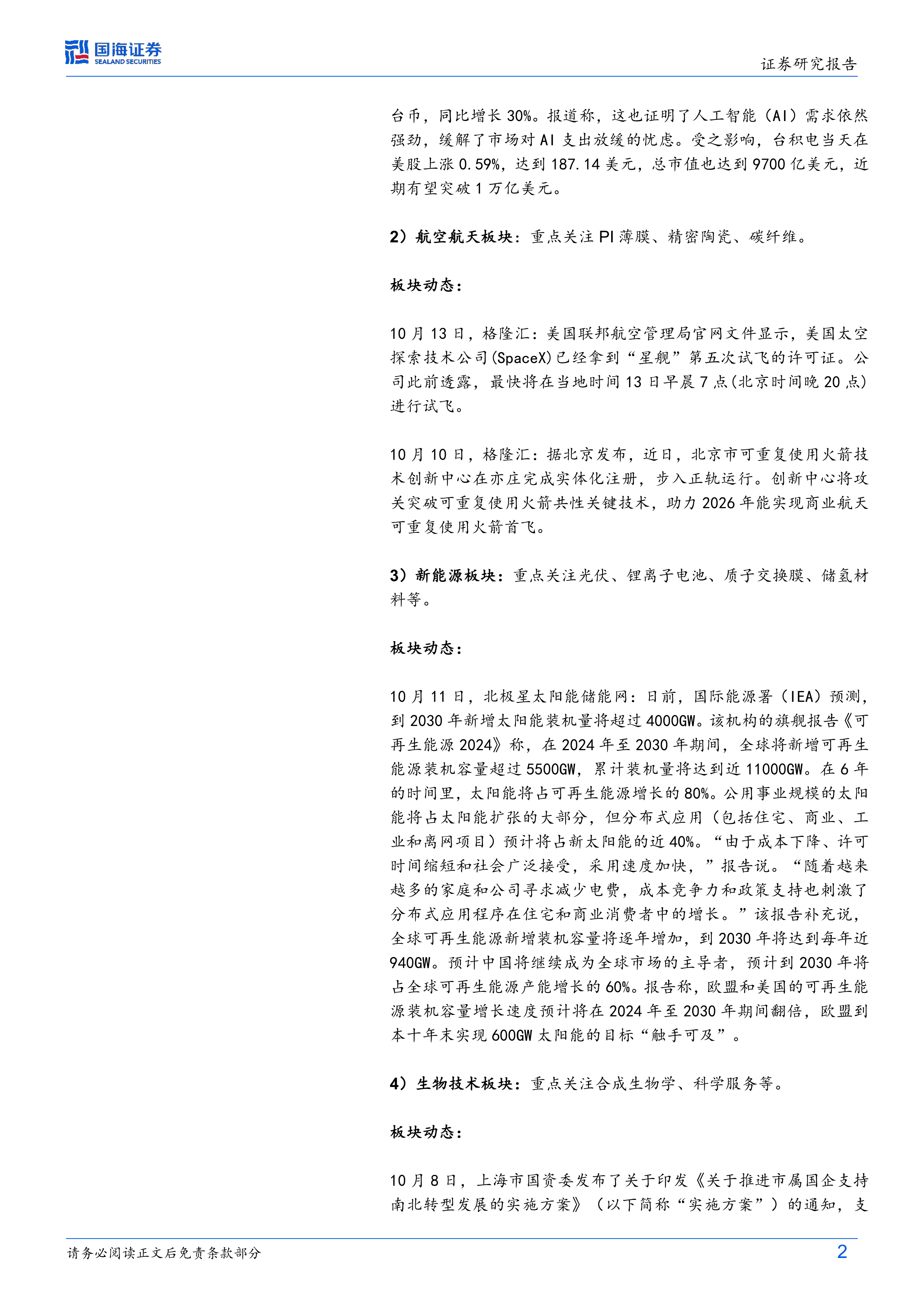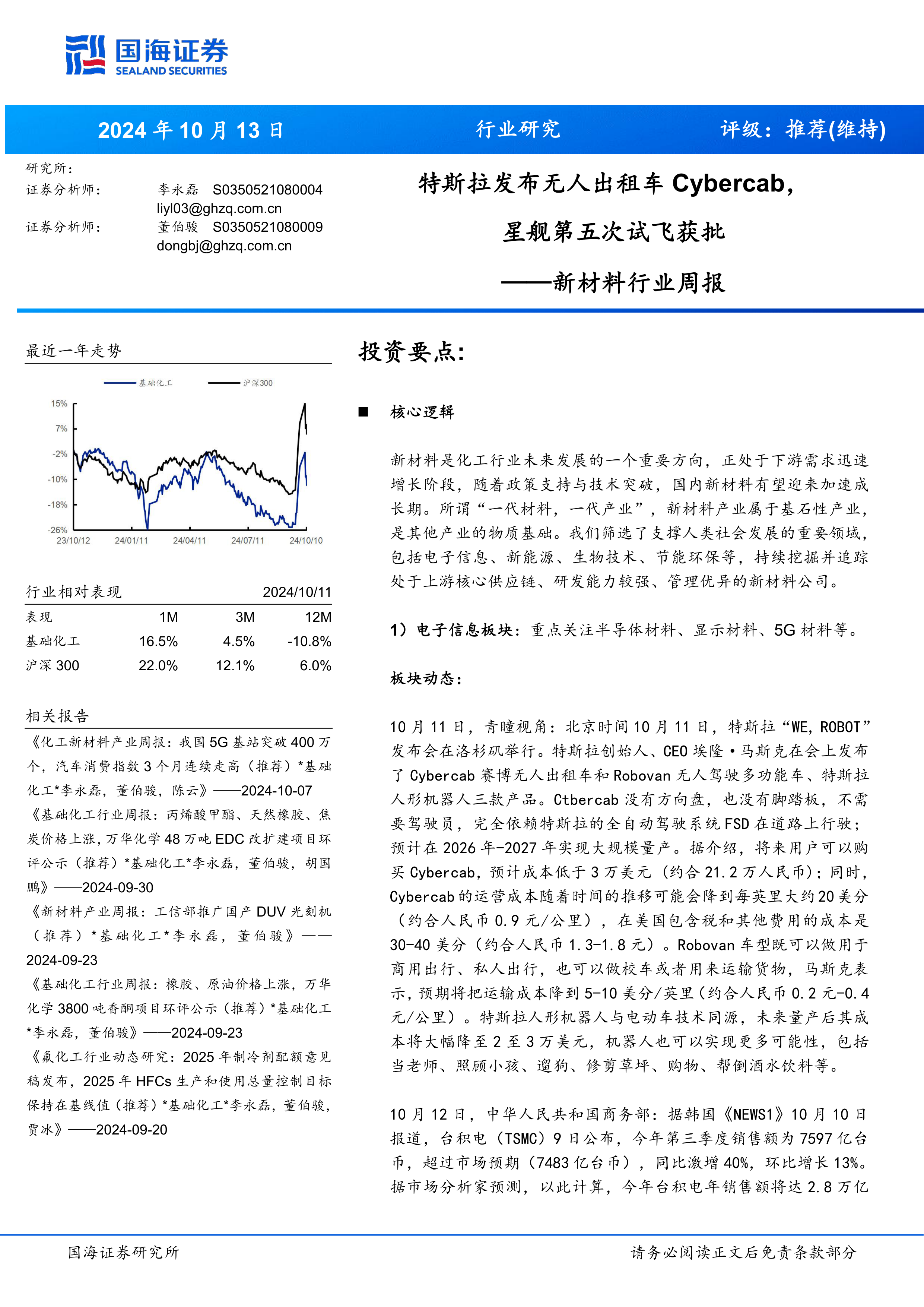 本报告的核心观点是:新材料行业正处于下游需求快速增长阶段,政策支持和技术突破有望加速其发展。维持新材料行业“推荐”评级。报告重点关注特斯拉发布的Cybercab无人出租车对电子信息板块的影响,以及SpaceX星舰第五次试飞获批对航空航天板块的利好消息。 报告同时分析了各新材料细分板块(电子信息、航空航天、新能源、生物技术、节能环保)的产业动态、关键数据及重点公司表现,并提供了相应的投资建议和风险提示。