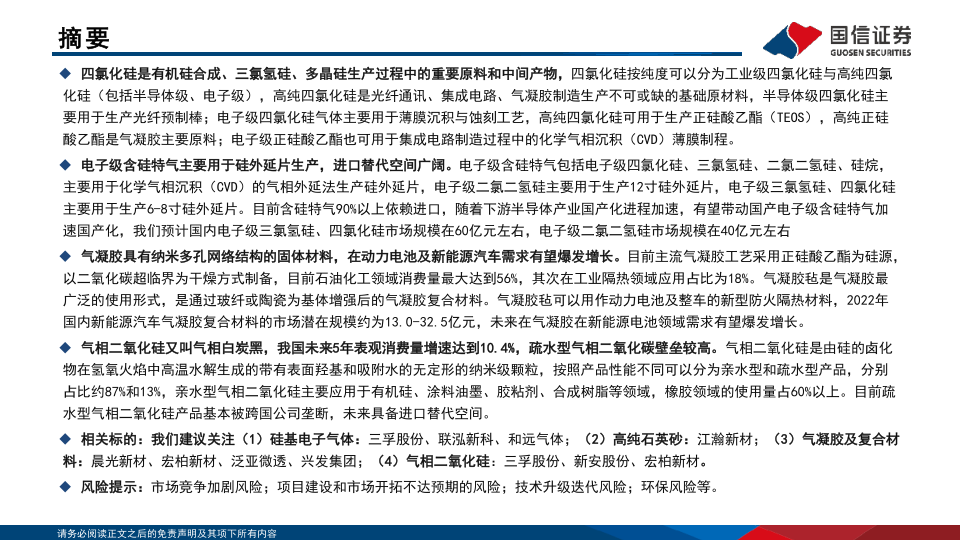 相关标的:我们建议关注(1)硅基电子气体:三孚股份、联泓新科、和远气体;(2)高纯石英砂:江瀚新材;(3)气凝胶及复合材料:晨光新材、宏柏新材、泛亚微透、兴发集团;(4)气相二氧化硅:三孚股份、新安股份、宏柏新材。