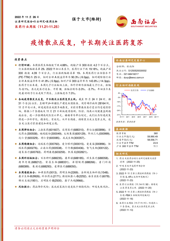 各地疫情散发且反复,中长期关注医药复苏主线。截至11月24日24时,据31个省(自治区、直辖市)和新疆生产建设兵团报告,现有确诊病例28164例,11月中旬以来,新冠疫情在我国多地散发,目前消费属性医疗需求仍受疫情影响,根据二十条措施及11月21日新版疫情检测、防控、隔离以及健康监测指南出台,进一步强调高风险区以单元、楼栋等为单位划定,我们认为防疫政策将进一步科学化、精准化、有效化。从中长期看,持续重点关注复苏主线,适当关注医疗资源建设和新冠主题。