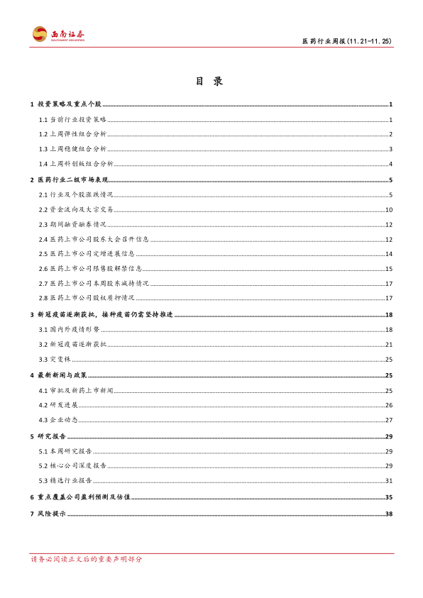 本部分列出了本周西南证券发布的医药行业研究报告,包括行业周报、创新药周报以及一些核心公司深度报告和精选行业报告。