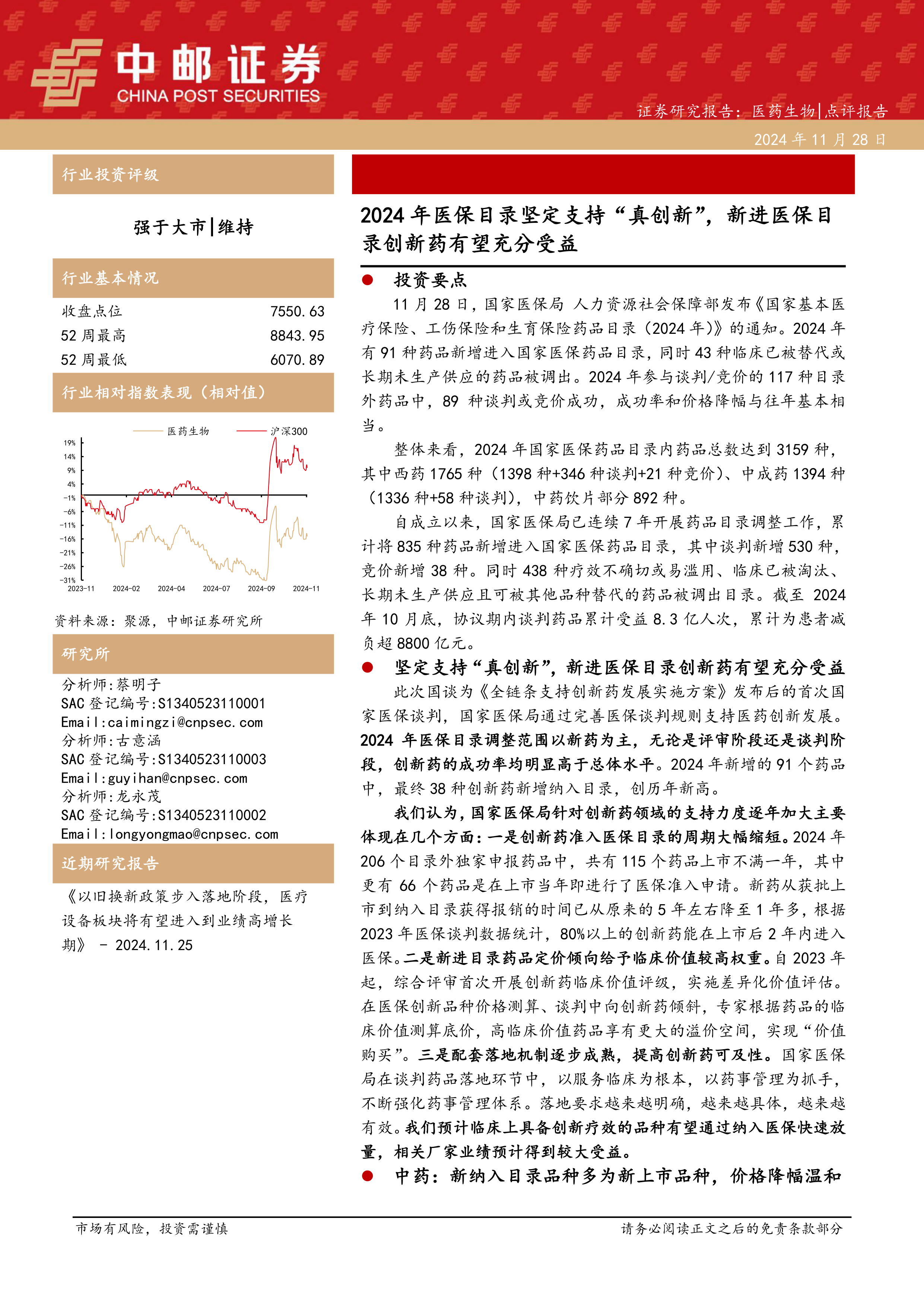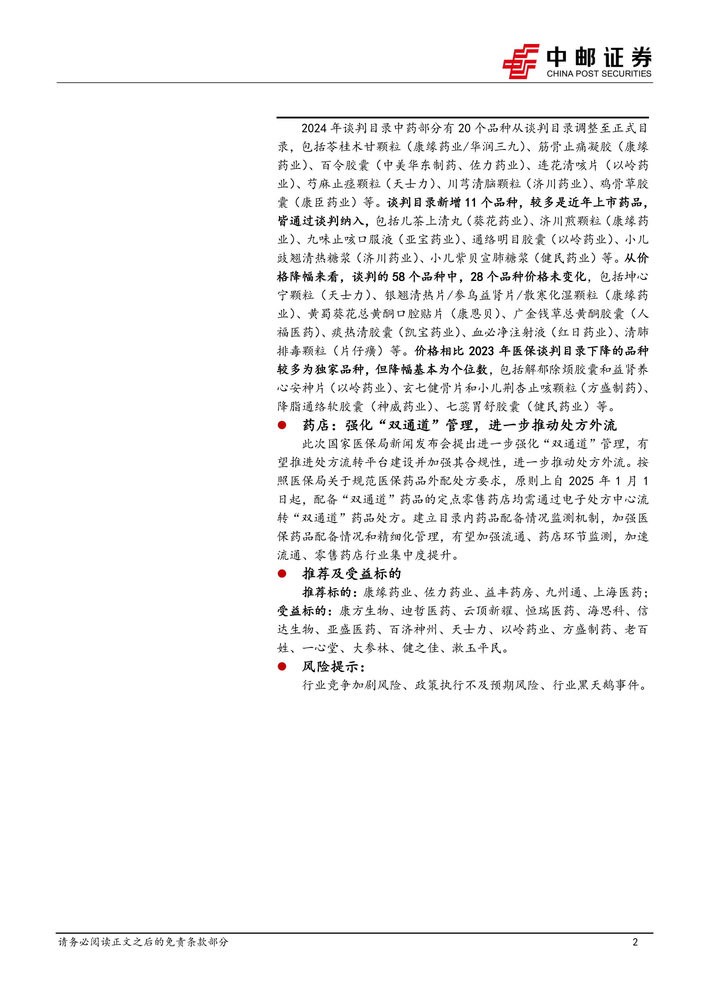 2024年国家医保目录调整体现了国家对医药创新和行业发展的重视,特别是对创新药的支持力度进一步加大。创新药准入速度加快、定价机制向临床价值倾斜以及配套落地机制的完善,将显著利好创新药企。同时,医保目录调整对中药和药店行业也产生了一定影响,中药新纳入品种多为新上市品种,价格降幅温和;强化“双通道”管理将进一步推动处方外流,利好医药流通企业。 本报告提供的投资建议仅供参考,投资者需根据自身情况进行独立判断。 报告中提到的个股和行业存在一定的市场风险,投资者需谨慎投资。