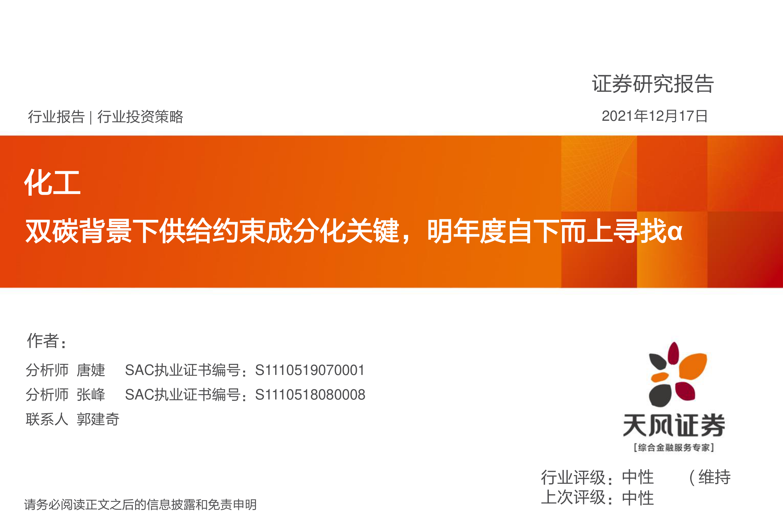 化工行业投资策略:双碳背景下供给约束成分化关键,明年度自下而上寻找α