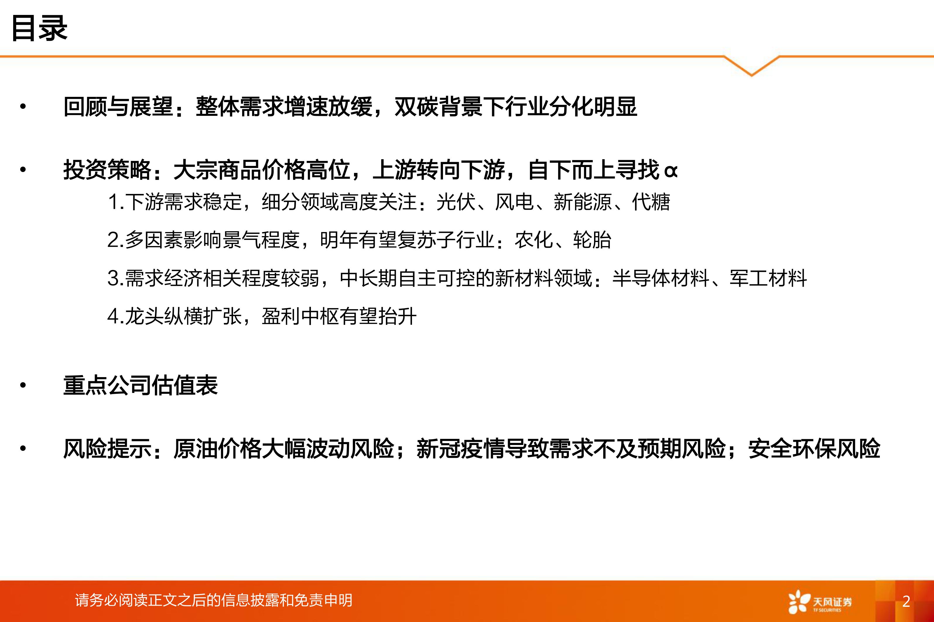本报告的核心观点是:在“双碳”目标背景下,化工行业面临供给侧约束成分化,需求增速放缓。未来投资策略应转向自下而上,重点关注下游需求稳定、细分领域景气度高的行业,例如光伏、风电、新能源和代糖等;同时关注明年有望复苏的农化和轮胎行业,以及中长期自主可控的新材料领域,如半导体材料和军工材料。龙头企业凭借纵向一体化扩张,盈利中枢有望抬升。