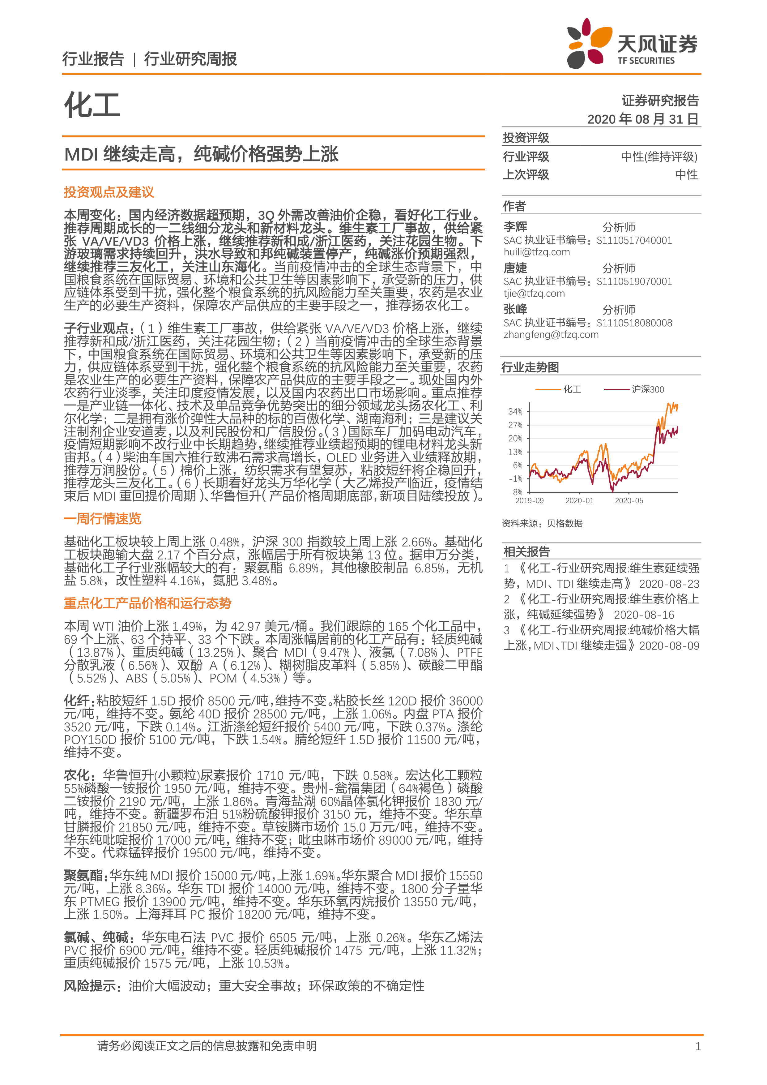 化工行业研究周报:MDI继续走高,纯碱价格强势上涨