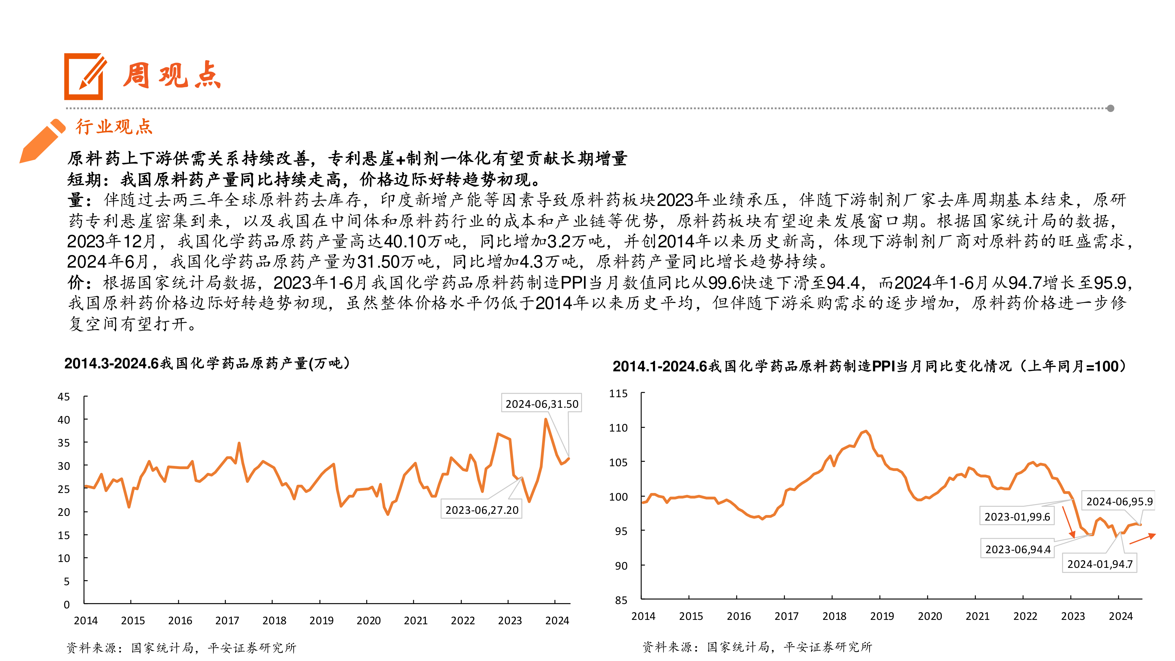 量:伴随过去两三年全球原料药去库存,印度新增产能等因素导致原料药板块2023年业绩承压,伴随下游制剂厂家去库周期基本结束,原研药专利悬崖密集到来,以及我国在中间体和原料药行业的成本和产业链等优势,原料药板块有望迎来发展窗口期。根据国家统计局的数据,2023年12月,我国化学药品原药产量高达40.10万吨,同比增加3.2万吨,并创2014年以来历史新高,体现下游制剂厂商对原料药的旺盛需求,2024年6月,我国化学药品原药产量为31.50万吨,同比增加4.3万吨,原料药产量同比增长趋势持续。