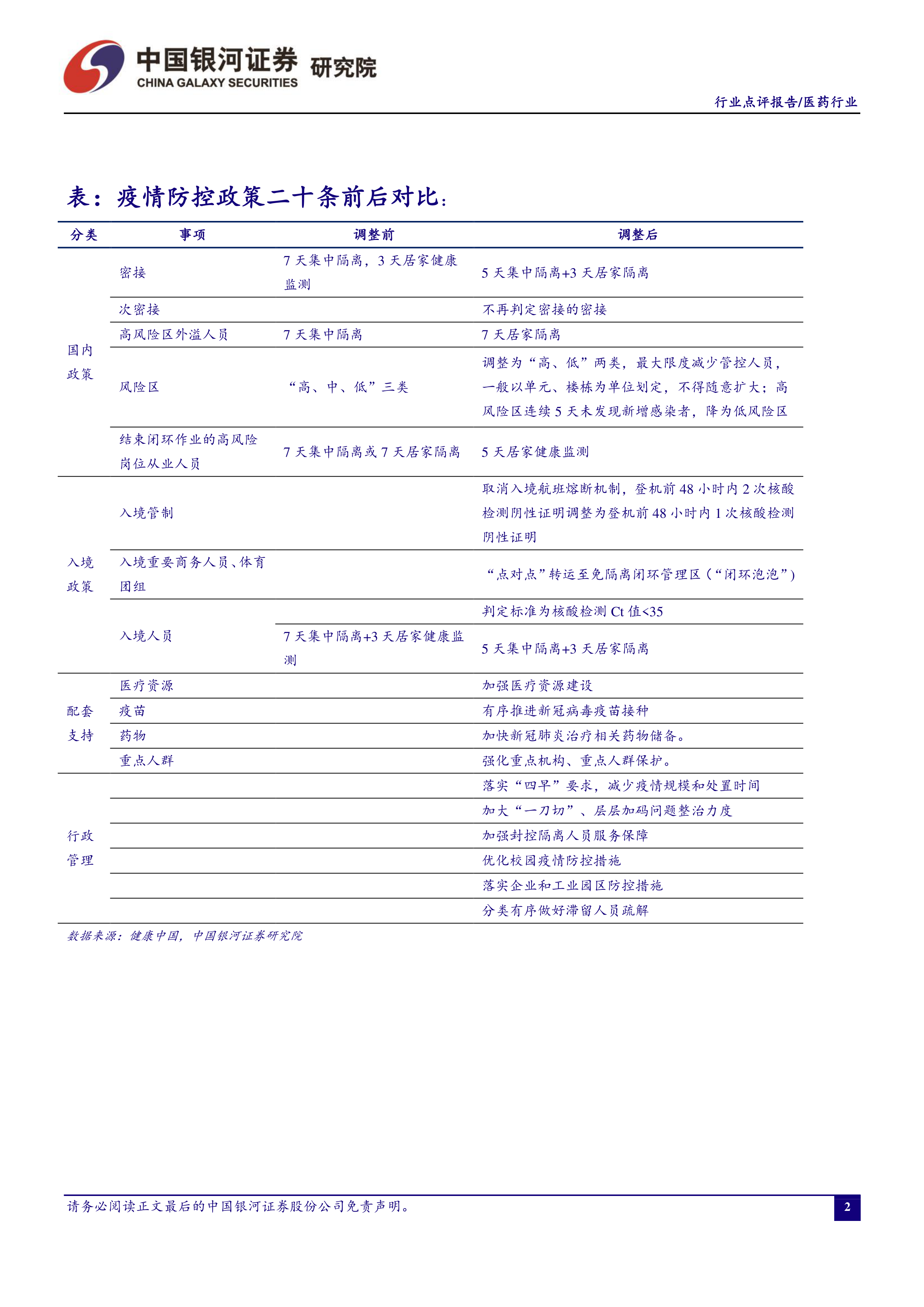 此次防疫政策优化是疫情防控和经济社会发展总体协调的结果。在坚持“外防输入、内防反弹”总策略和“动态清零”总方针不变的基础上,政策调整旨在最大程度保护人民生命安全和身体健康,同时最大限度减少疫情对经济社会发展的影响。 多项措施的优化,例如减少隔离时间、调整风险区划定标准等,将直接利好医药行业。
