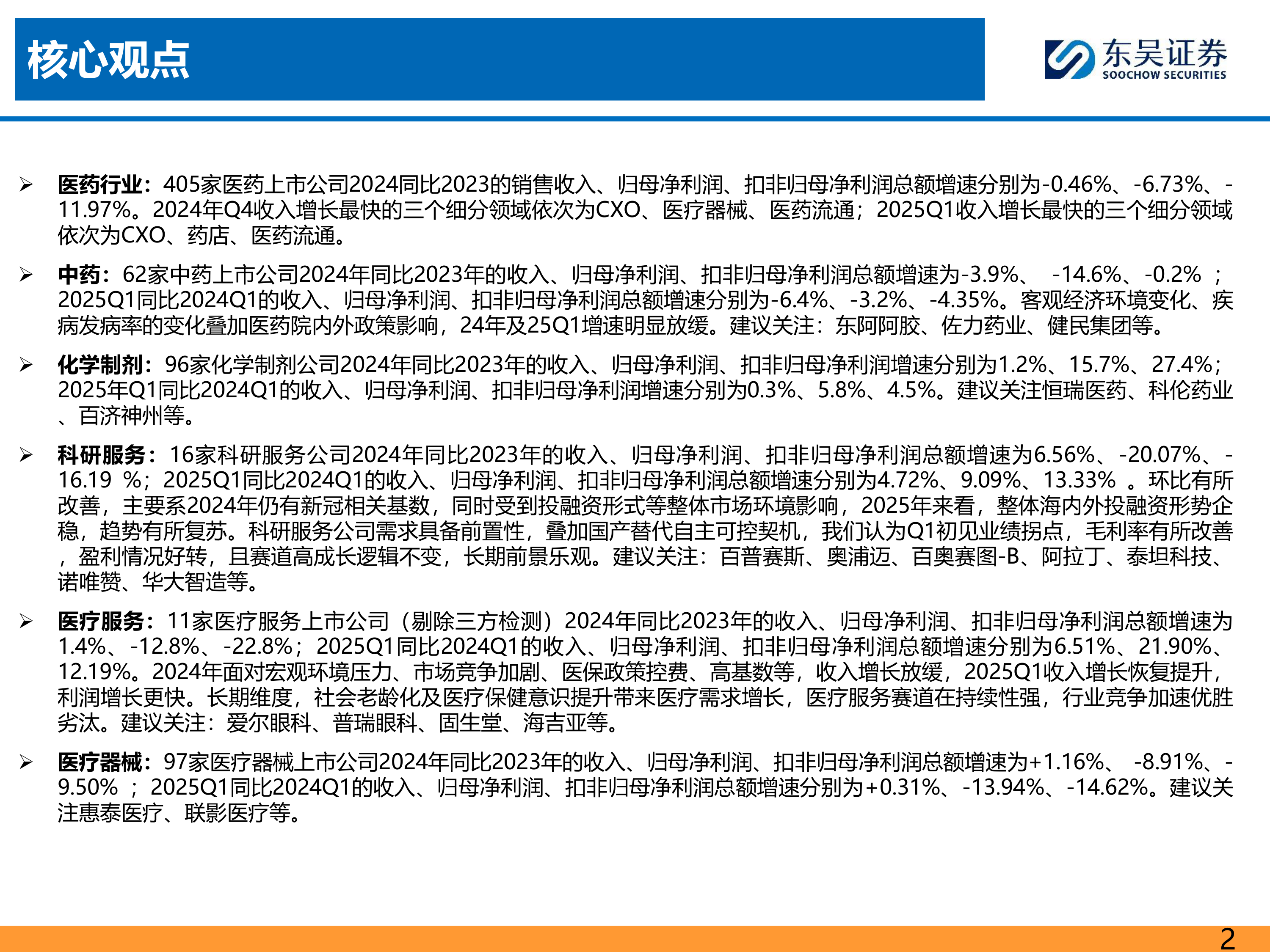 本报告基于东吴证券研究所对405家医药上市公司2024年及2025年Q1数据的统计分析,核心观点如下: