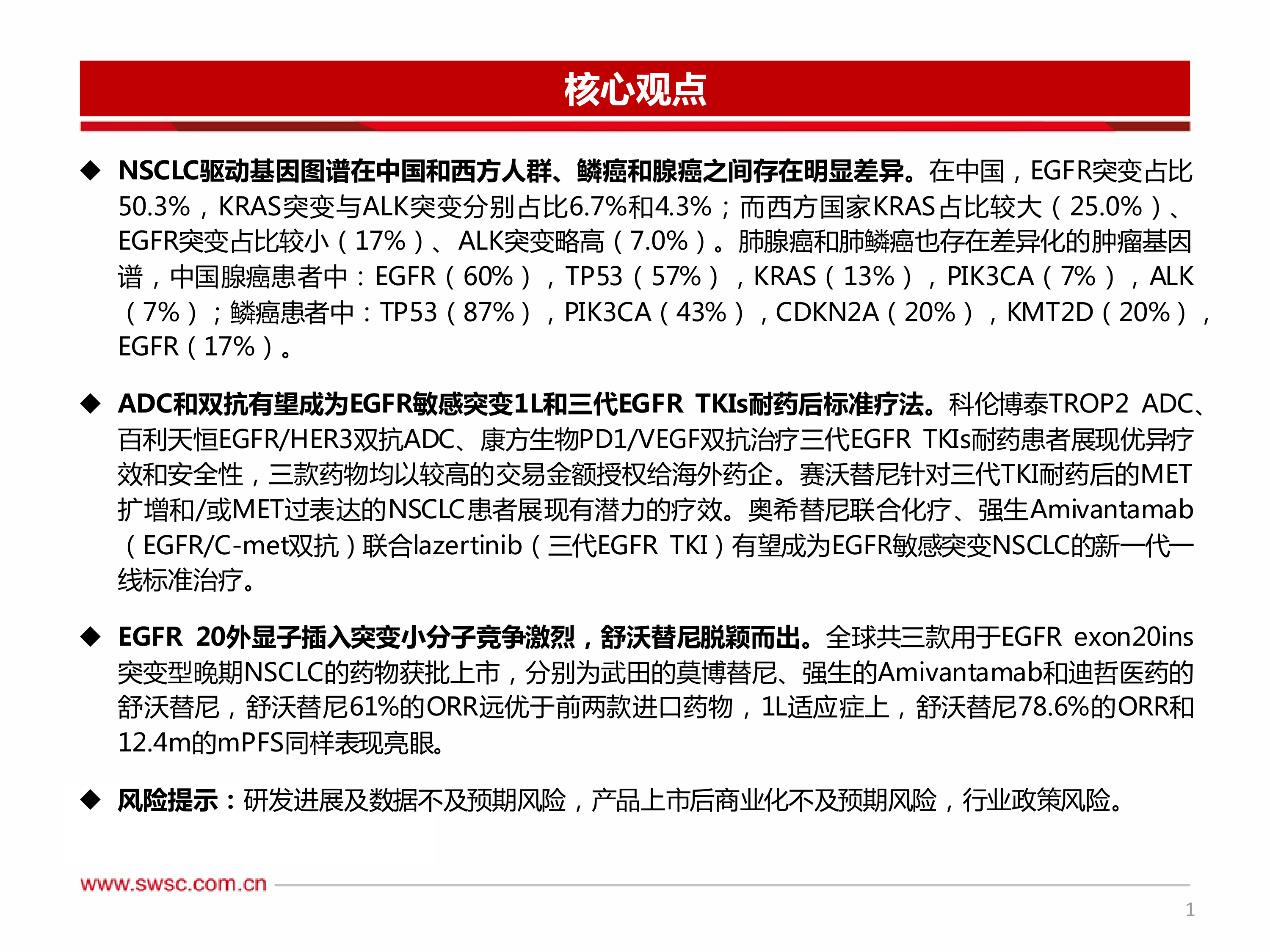 本报告的核心观点是:中国NSCLC驱动基因图谱与西方国家存在显著差异,EGFR突变在中国人群中占比更高;ADC和双抗药物有望成为EGFR敏感突变NSCLC的一线和三代TKI耐药后的标准疗法;EGFR 20外显子插入突变小分子药物竞争激烈,舒沃替尼展现出显著疗效优势。