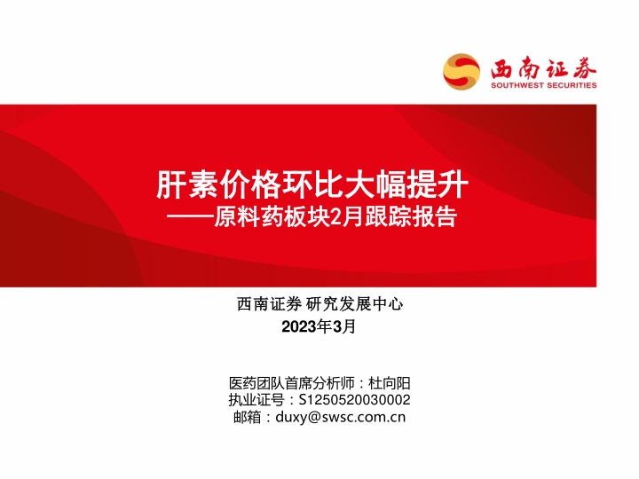 本报告对2023年1月原料药市场进行了全面分析,重点关注了肝素价格的大幅上涨以及其他主要原料药的价格波动。报告结合Wind和PDB数据库数据,深入分析了价格波动的背后原因,并对市场未来走势进行了预测,提出了相应的投资建议和风险提示。报告内容翔实,数据可靠,分析深入,为投资者提供了有价值的参考信息。 需要注意的是,报告中的信息和意见不构成对任何个人的投资建议,投资者应自行承担投资风险。