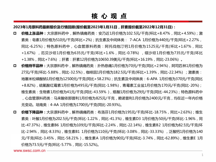 本报告的核心观点是:2023年1月,原料药市场价格波动显著,肝素价格环比大幅上涨16.19%,达到10650.39美元/千克,成为市场关注焦点。其他原料药价格涨跌互现,解热镇痛药、抗生素及中间体、激素类药和维生素类药价格均有不同程度的波动。 报告从短期和长期两个维度分析了市场走势,并提出了相应的投资建议和风险提示。