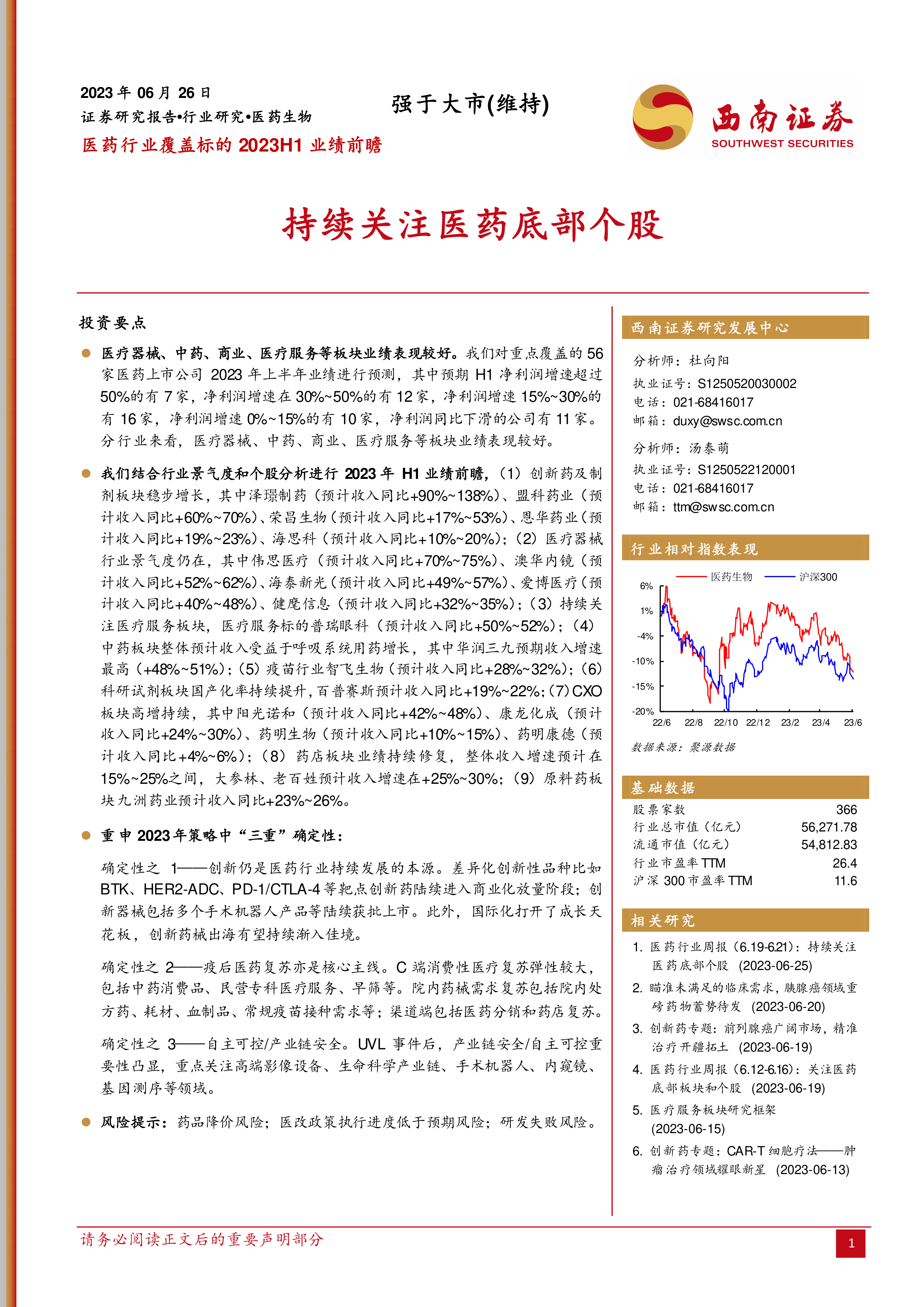 本报告以2023年上半年医药行业业绩前瞻为主题,对56家医药上市公司进行了业绩预测,并对不同细分行业进行了深入分析。