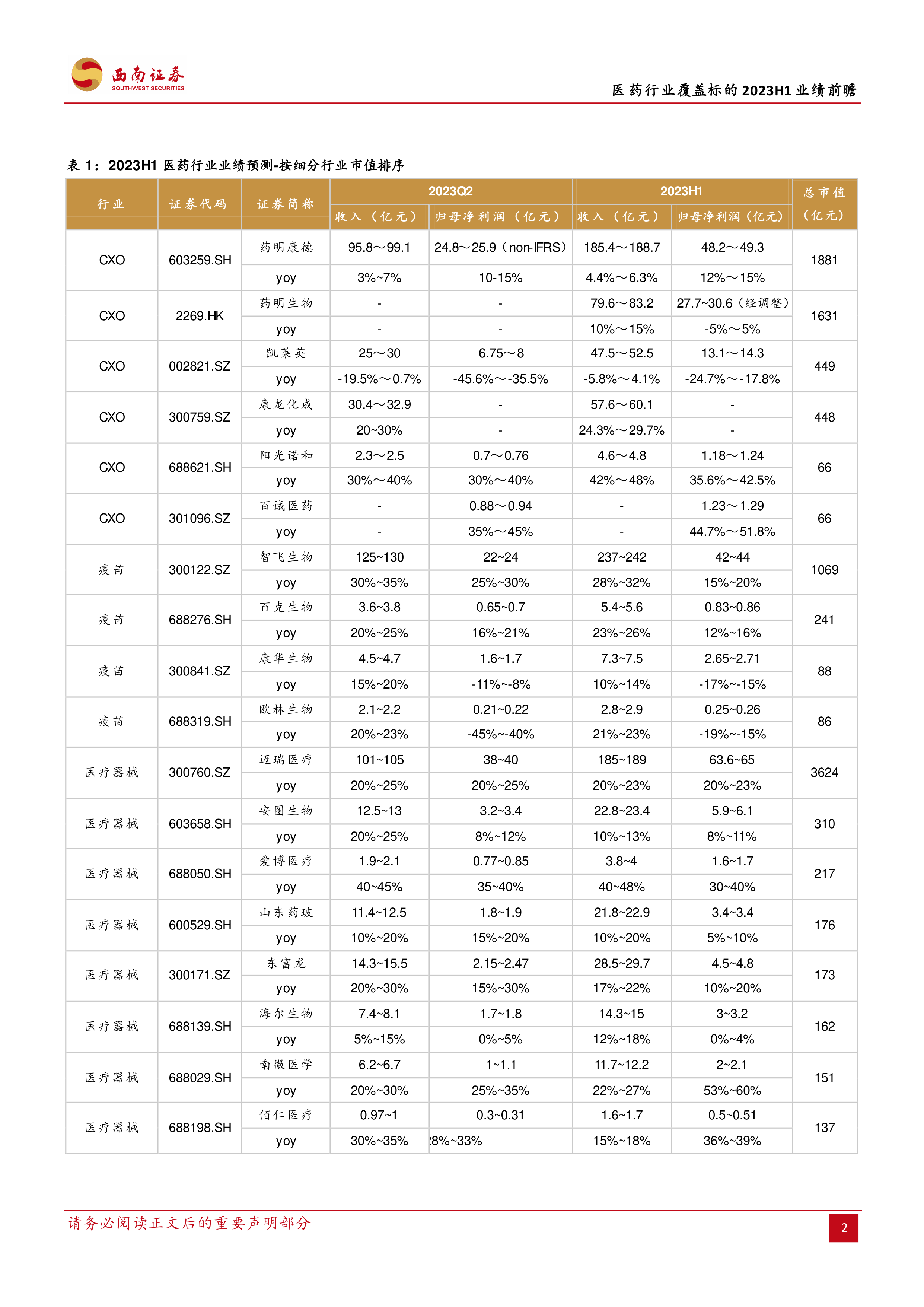 表格1按细分行业市值排序,展示了各公司2023年Q2和H1的收入、归母净利润以及同比增速预测范围。例如,CXO板块的药明康德、药明生物和凯莱英等公司业绩表现相对稳定,而部分医疗器械和中药公司则展现出较高的增长潜力。