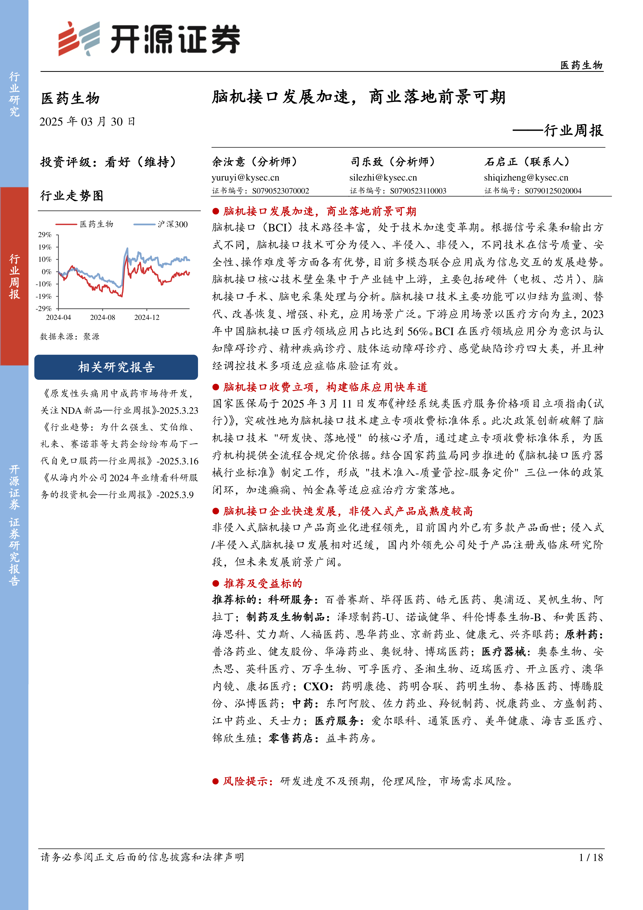 医药生物行业周报:脑机接口发展加速,商业落地前景可期