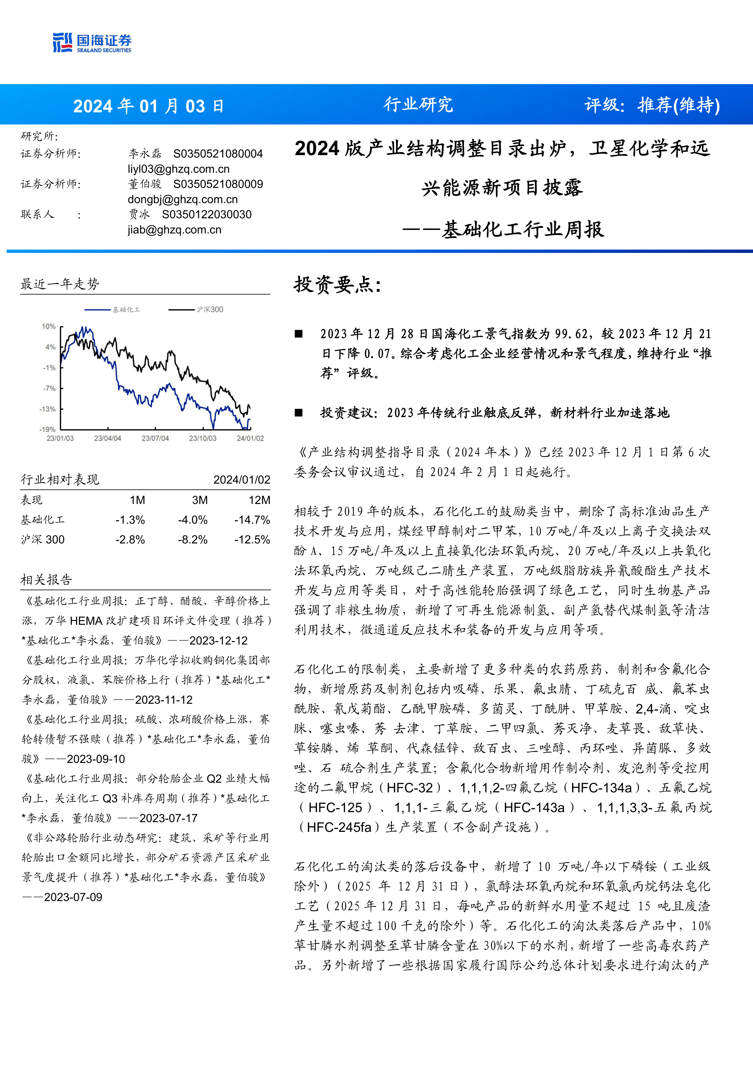 基础化工行业周报:2024版产业结构调整目录出炉,卫星化学和远兴能源新项目披露