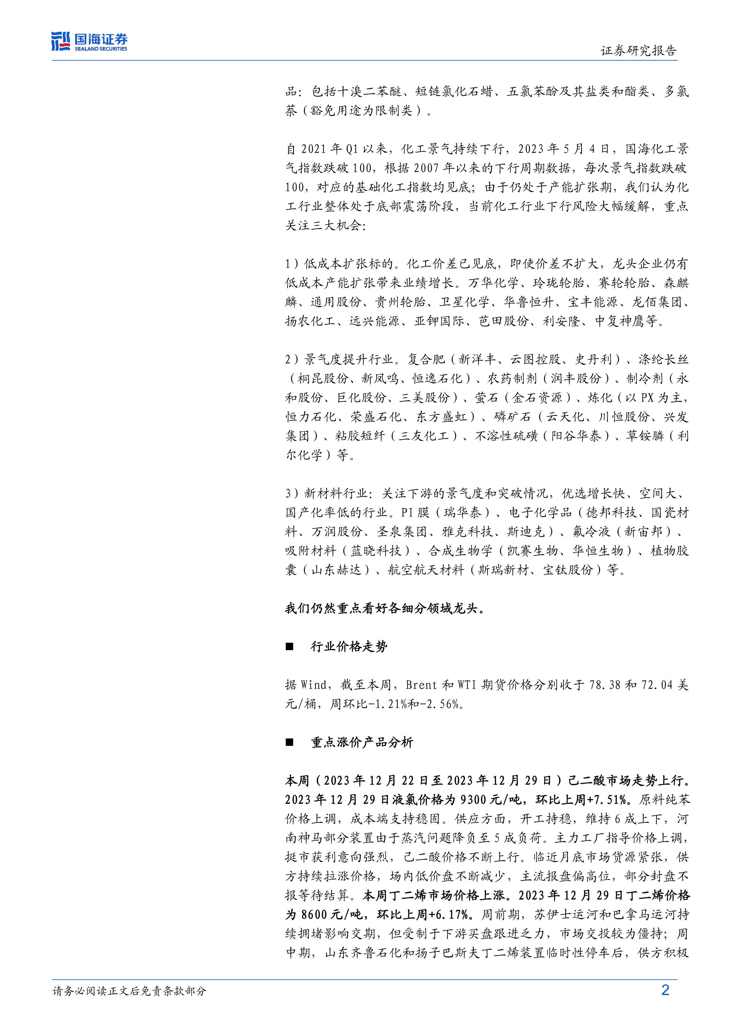 本报告对2023年12月22日至2023年12月29日期间的基础化工行业进行了全面分析。报告维持对基础化工行业的“推荐”评级,并重点关注低成本扩张标的、景气度提升行业和新材料行业三大投资机会。报告详细跟踪了多家重点化工企业的经营状况和项目进展,分析了行业价格走势和重点产品价格波动的原因,并提供了大量的图表数据,为投资者提供参考。 需要注意的是,宏观经济变化、油价波动、环保政策以及产品价格大幅波动等因素都可能对化工行业产生影响,投资者需谨慎决策。
