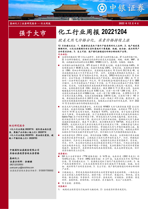 12 月份建议关注: 1、能源供应危机下海外产能受限的化工品种; 2、 地产端政策频频利好,以及未来稳增长项目实际落地对于聚氨酯、纯碱、钛白粉、减水剂等产品的需求拉动; 3、自主可控、国产替代持续进行的部分新材料产品等。