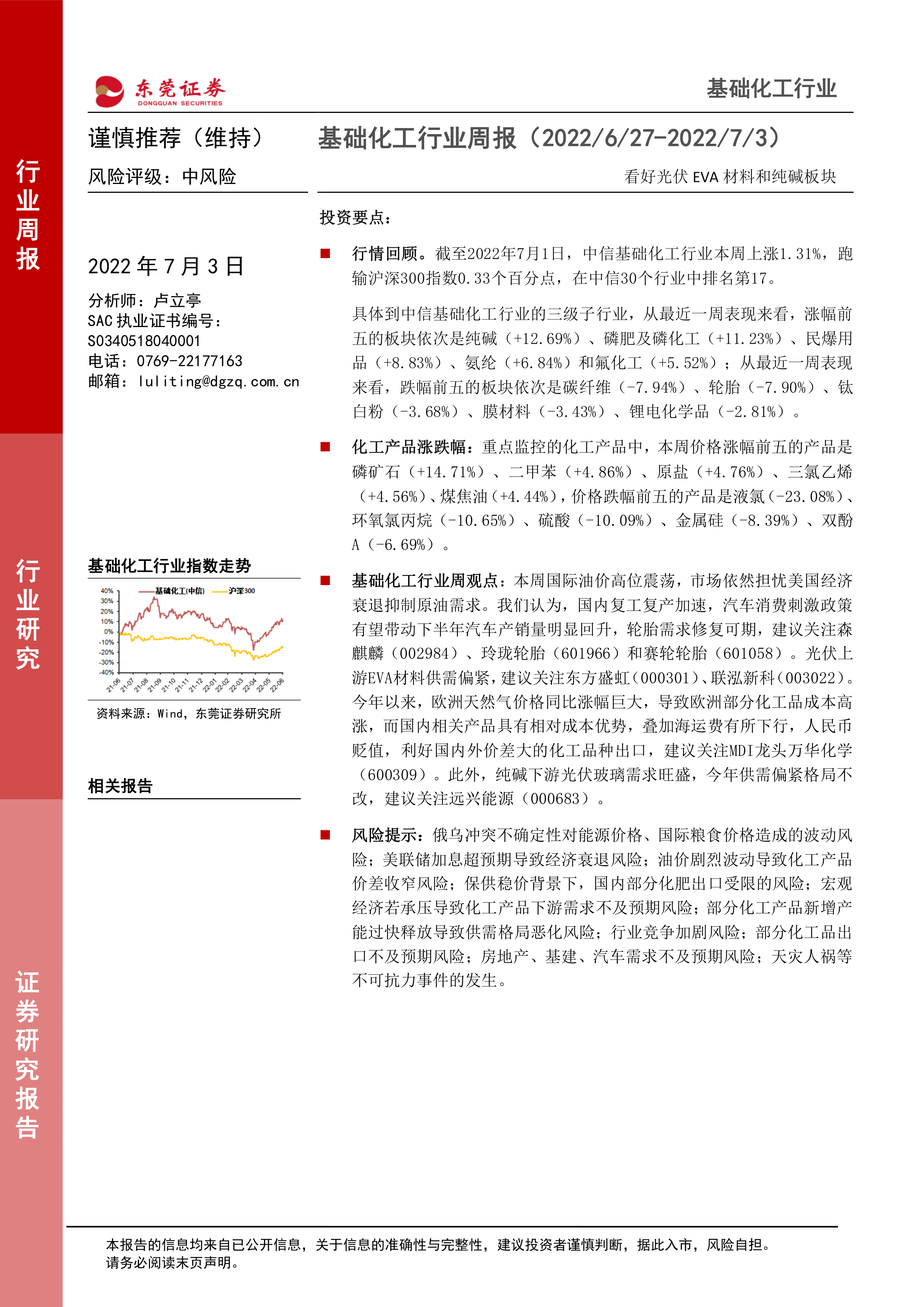 本报告对2022年6月27日至7月3日基础化工行业一周的市场表现进行了全面分析,涵盖了行业整体走势、子行业分化、化工产品价格波动、产业新闻、公司公告以及投资建议等方面。报告指出,基础化工行业内部存在显著分化,部分子行业和个股表现强劲,但同时也面临诸多风险。投资者应谨慎乐观,关注行业发展趋势和公司基本面,并根据自身风险承受能力做出投资决策。 报告特别强调了光伏EVA材料、纯碱和轮胎等板块的投资机会,并对相关公司进行了详细分析,为投资者提供了有价值的参考信息。 然而,投资者仍需密切关注国际油价波动、宏观经济形势以及下游需求变化等因素,以规避潜在风险。