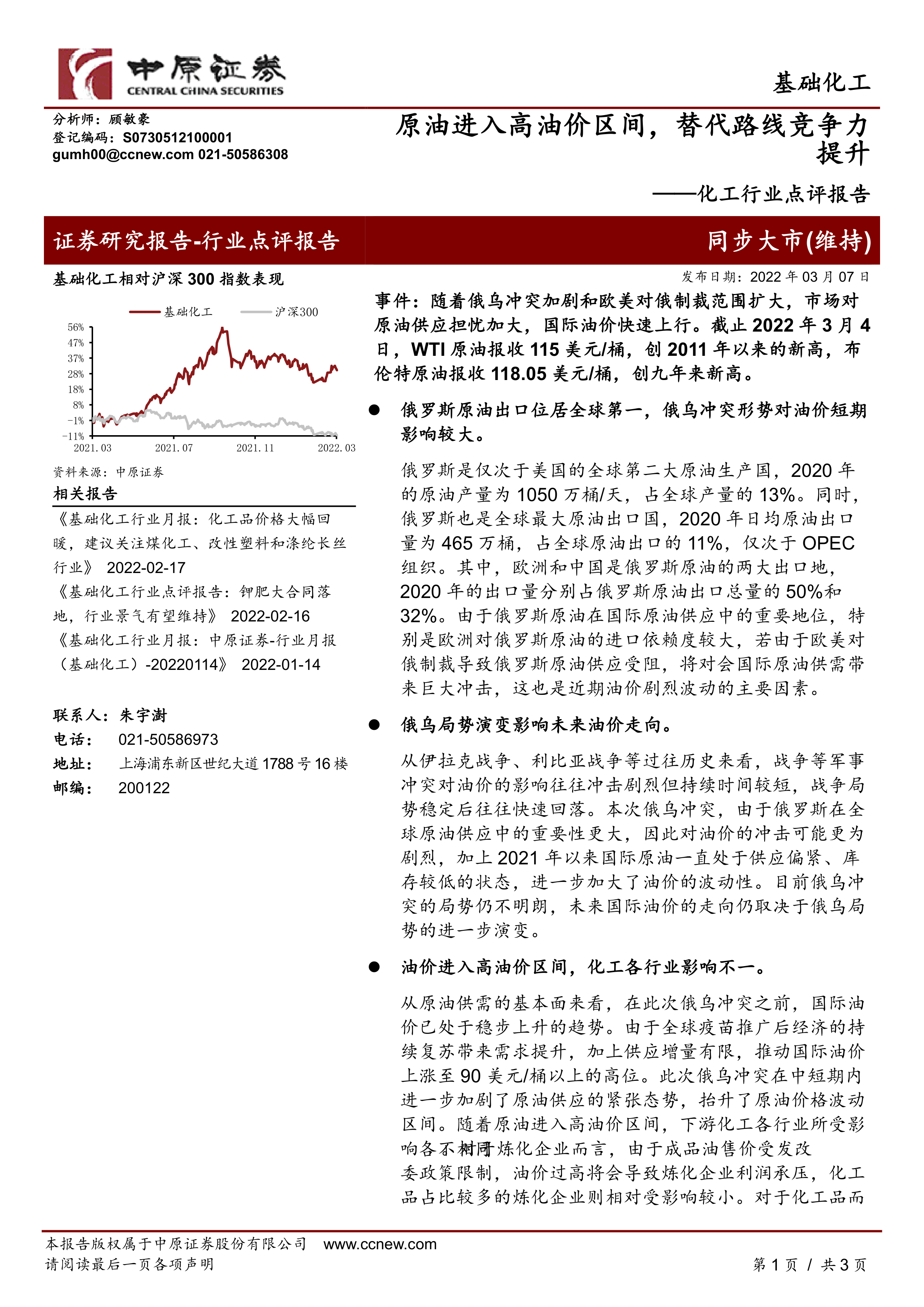 本报告基于俄乌冲突引发的国际油价飙升,对基础化工行业进行了深入分析。报告指出,高油价对不同化工细分行业的影响存在差异,炼化企业面临利润承压,而煤化工等替代路线企业则有望受益。报告建议投资者关注拥有油气资源的上市公司、油服行业以及煤化工、轻烃裂解等替代路线龙头企业,并提示了行业需求下滑和原油价格大幅波动等潜在风险。 报告数据显示,基础化工行业在2021年下半年至2022年3月期间,相对沪深300指数表现出一定的波动性,这与国际油价的波动密切相关。 未来基础化工行业的走势将很大程度上取决于地缘政治局势的演变以及国际油价的波动情况。