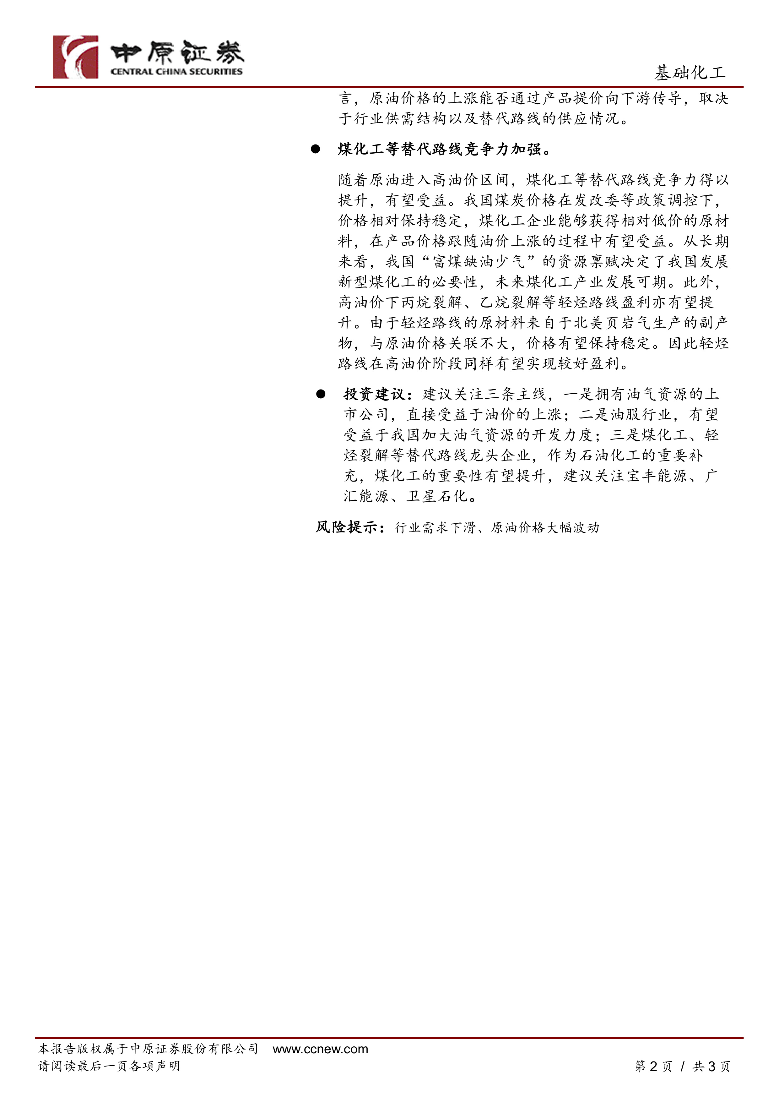 投资建议:建议关注三条主线,一是拥有油气资源的上市公司,直接受益于油价的上涨;二是油服行业,有望受益于我国加大油气资源的开发力度;三是煤化工、轻烃裂解等替代路线龙头企业,作为石油化工的重要补充,煤化工的重要性有望提升,建议关注宝丰能源、广汇能源、卫星石化。