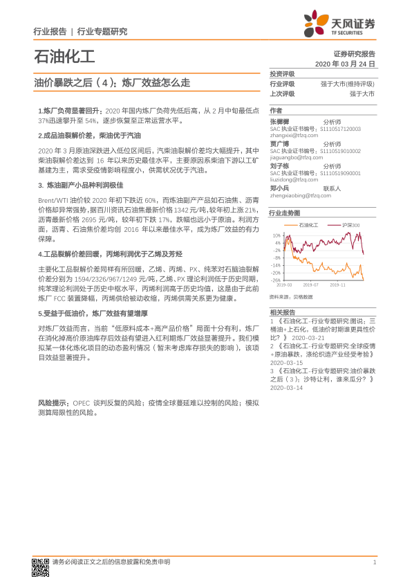 本报告基于对2020年3月石油化工行业数据的分析,得出结论:尽管疫情和油价暴跌对炼厂初期运营造成冲击,但“低原料成本+高产品价格”的局面最终促使炼厂效益显著提升。 柴油、炼油副产品以及丙烯等产品的优异表现是炼厂效益增长的主要驱动力。 报告通过大量数据图表,对炼厂负荷、成品油裂解价差、炼油副产品利润、主要化工品裂解价差以及炼厂效益进行了全面的分析,为投资者提供了有价值的参考信息。 然而,报告也指出了OPEC谈判反复、疫情全球蔓延以及模拟测算局限性等风险因素。