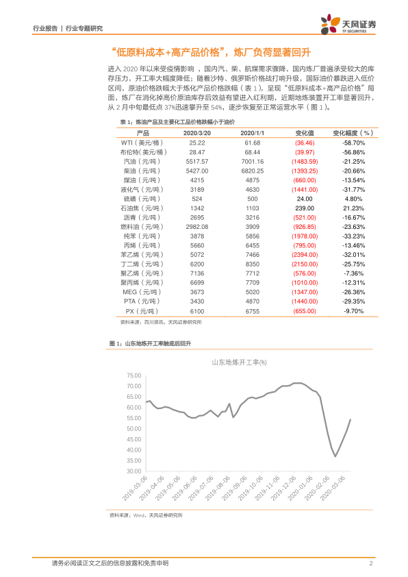 本报告的核心观点是:2020年3月,受疫情和油价暴跌的双重影响,国内炼厂经历了先低后高的负荷变化,但最终受益于“低原料成本+高产品价格”的局面,炼厂效益有望显著提升。具体而言,柴油裂解价差表现优于汽油,炼油副产品(如石油焦、沥青)利润极佳,部分化工品裂解价差回暖,丙烯利润尤为突出。
