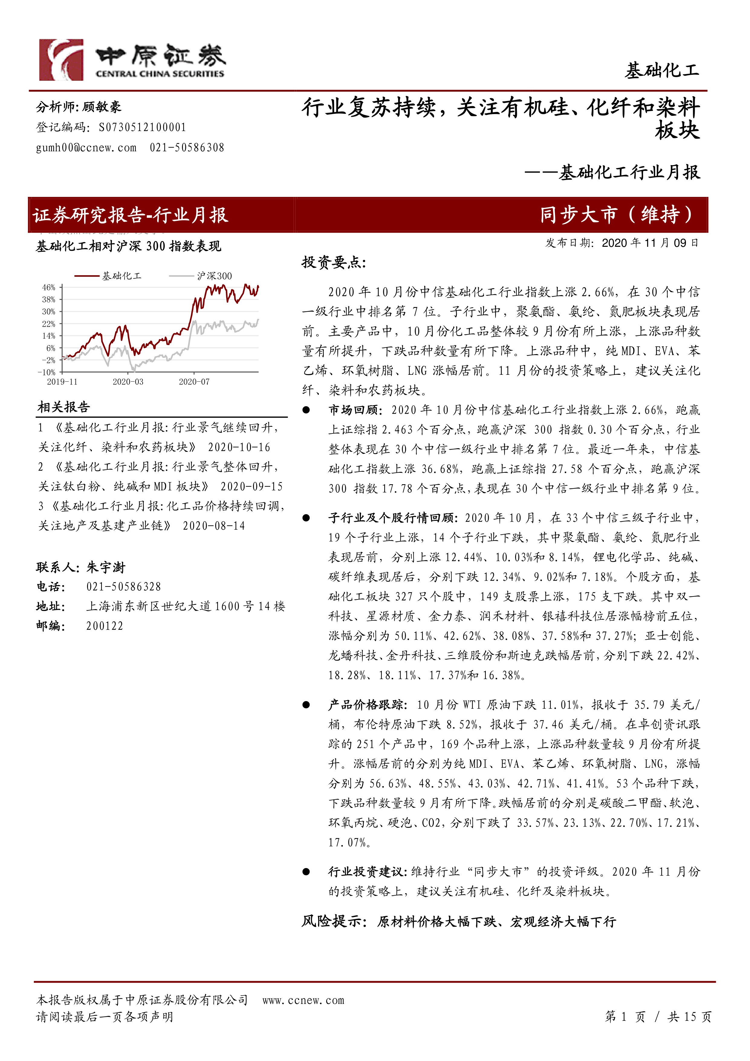 行业投资建议:维持行业“同步大市”的投资评级。2020年11月份的投资策略上,建议关注有机硅、化纤及染料板块。