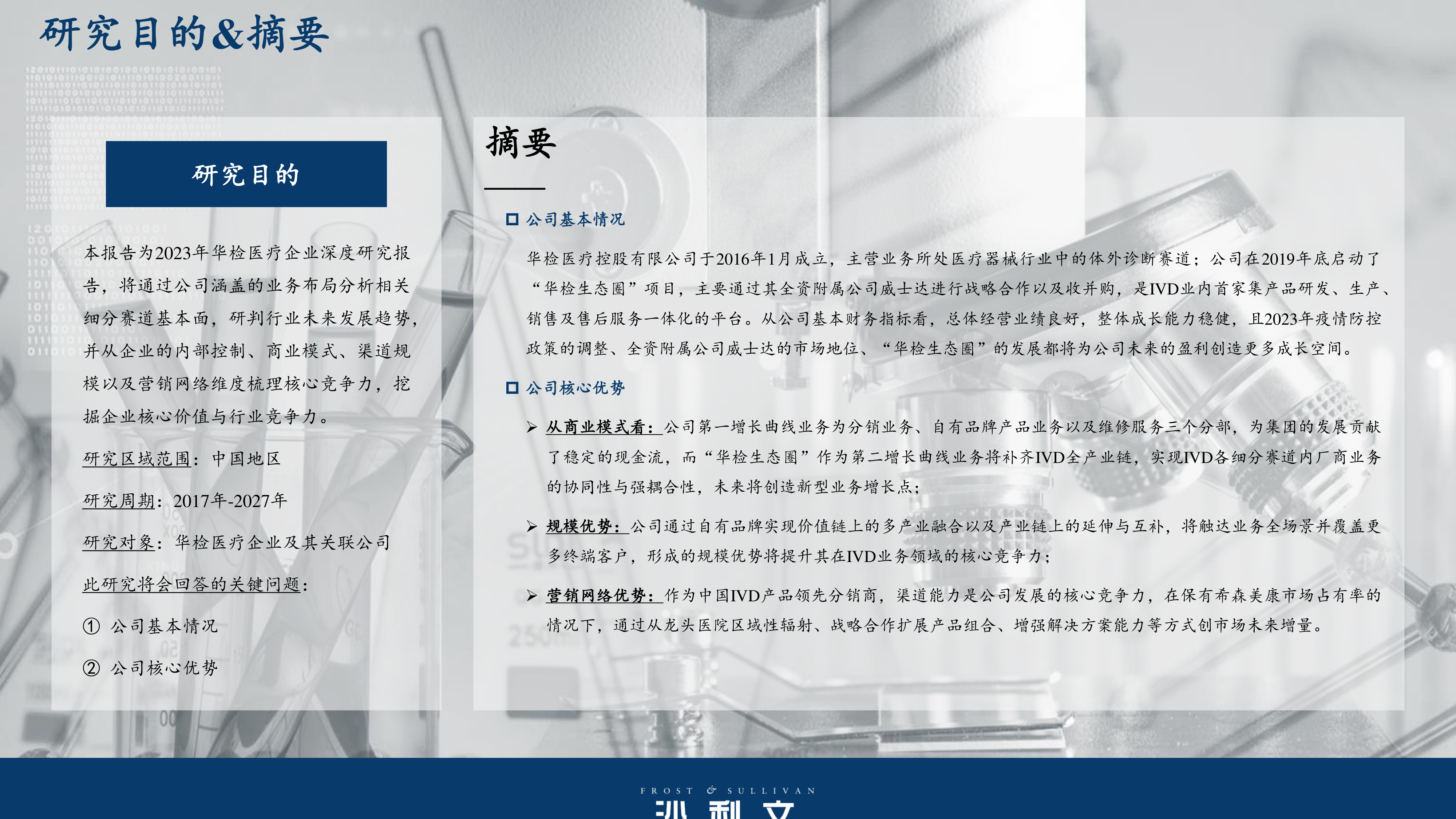本报告的核心观点是:华检医疗控股有限公司(以下简称“华检医疗”)凭借其独特的商业模式、规模优势和营销网络优势,在竞争激烈的中国体外诊断(IVD)市场中展现出强劲的增长潜力。报告通过对华检医疗及其关联公司在血液及体液诊断、微生物检测、分子诊断和临床质谱检测等IVD细分赛道的业务布局、市场规模、竞争格局以及未来发展趋势的分析,揭示了华检医疗的核心竞争力及其未来发展前景。