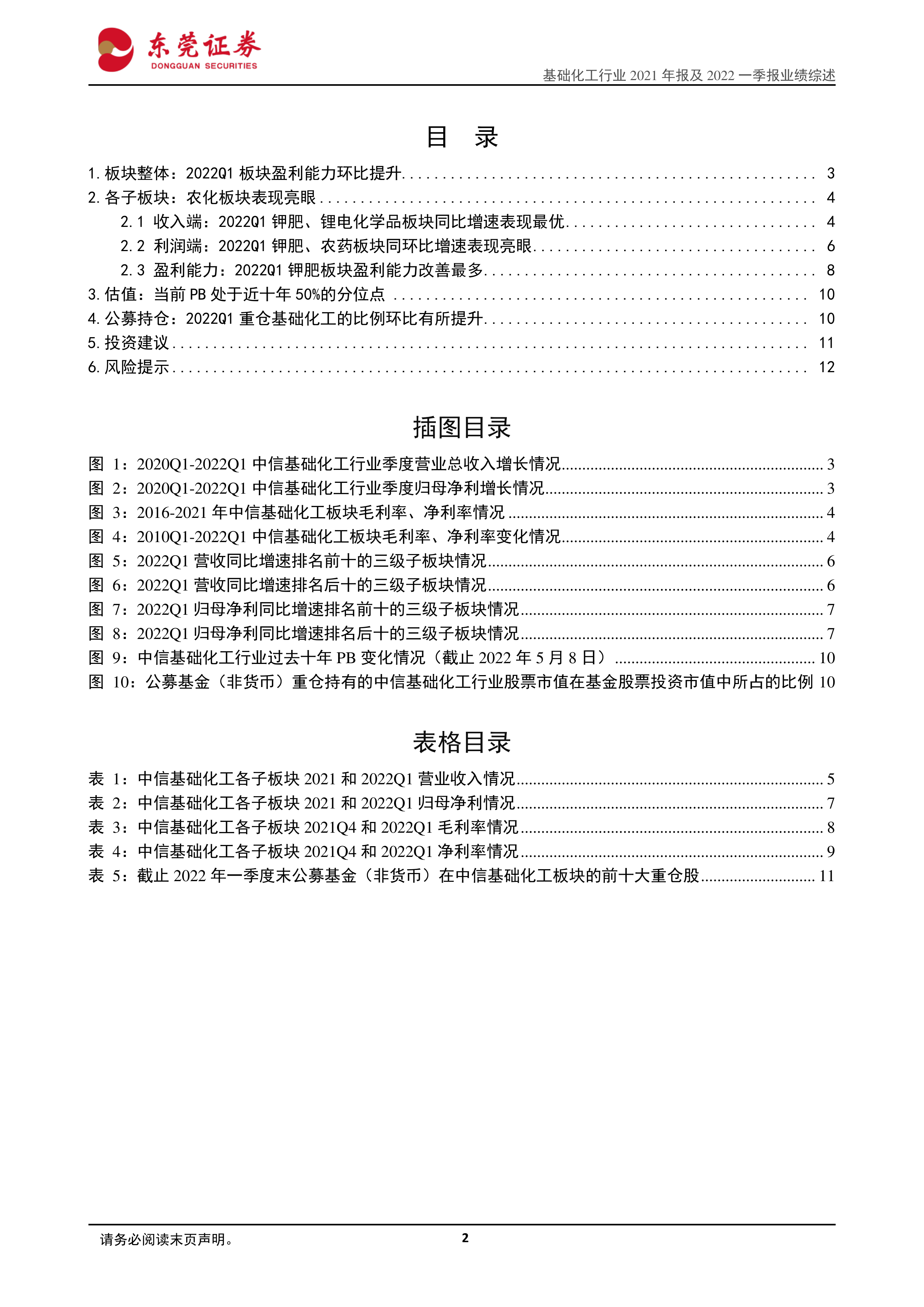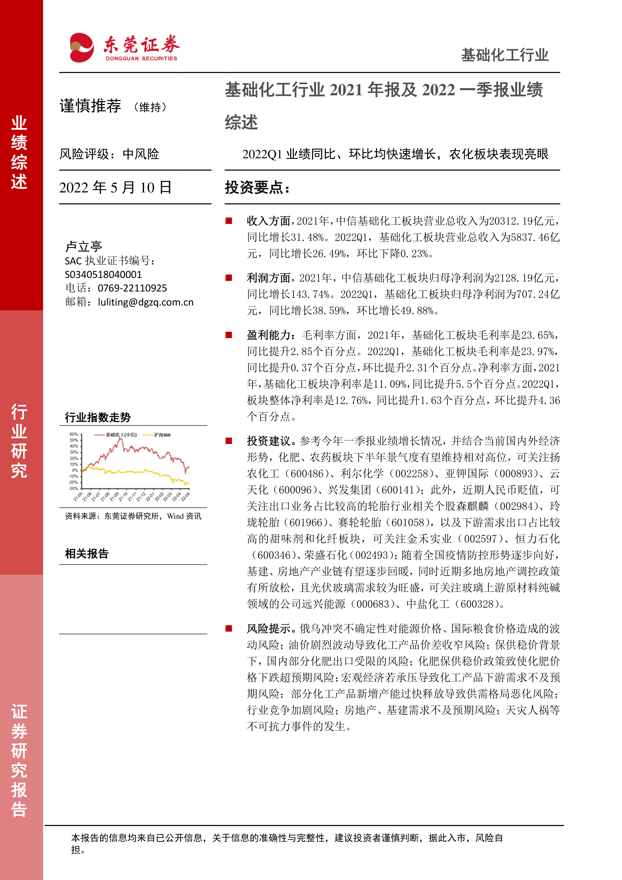 本报告基于东莞证券研究所发布的《基础化工行业2021年报及2022一季报业绩综述》报告,对2021年和2022年第一季度基础化工行业市场表现进行数据分析,并提出投资建议和风险提示。核心观点如下: