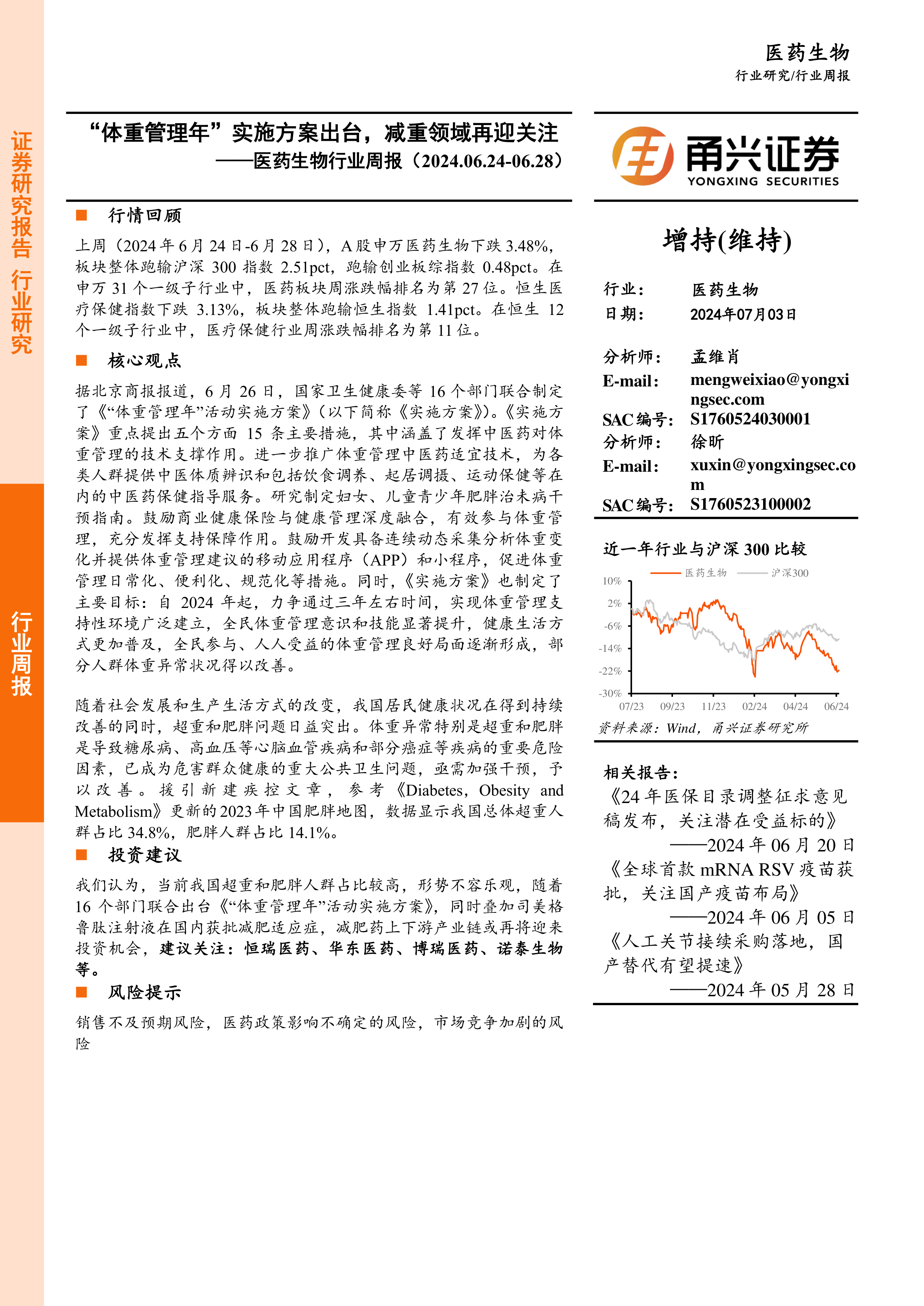 医药生物行业周报:“体重管理年”实施方案出台,减重领域再迎关注