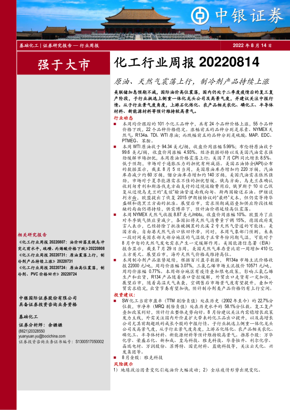 报告跟踪了101个化工品种的价格变化,其中24个品种价格上涨,55个品种价格下跌,22个品种价格稳定。涨幅前五的品种包括尿素、NYMEX天然气、R134a、TDI和WTI原油;跌幅前五的品种包括硫酸、MAP、EDC、PTMEG和苯胺。 WTI原油和布伦特原油价格本周震荡上行,主要原因是经济数据好转和美国汽油需求强劲。NYMEX天然气价格上涨10%,主要受欧盟应对俄气供应减少的措施影响。制冷剂产品价格持续上涨,主要由于高温天气和空调售后市场景气度提升。报告还提供了相关图表,直观地展现了本周化工产品价格涨跌幅前五名以及涨跌幅前五子行业的情况。