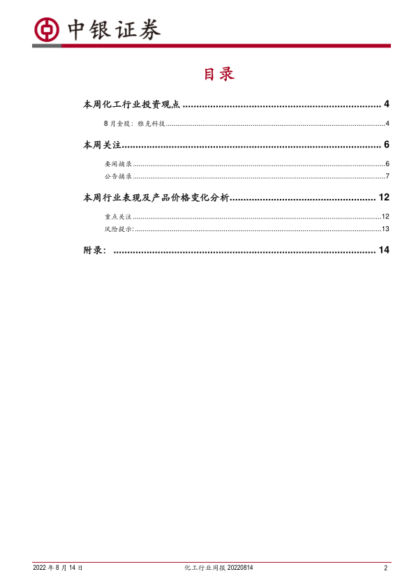 本报告基于对宏观经济形势、行业数据和公司基本面的综合分析,认为化工行业整体走势向好,但不同子行业景气度存在差异。 报告建议投资者关注一体化龙头公司和高景气度子行业,并密切关注中报行情,特别是前期超跌的成长个股。 同时,报告也提示了地缘政治因素变化和全球疫情形势变化可能带来的风险。 报告中提供的公司投资建议和评级仅供参考,投资者应根据自身情况进行独立判断,并承担相应的投资风险。