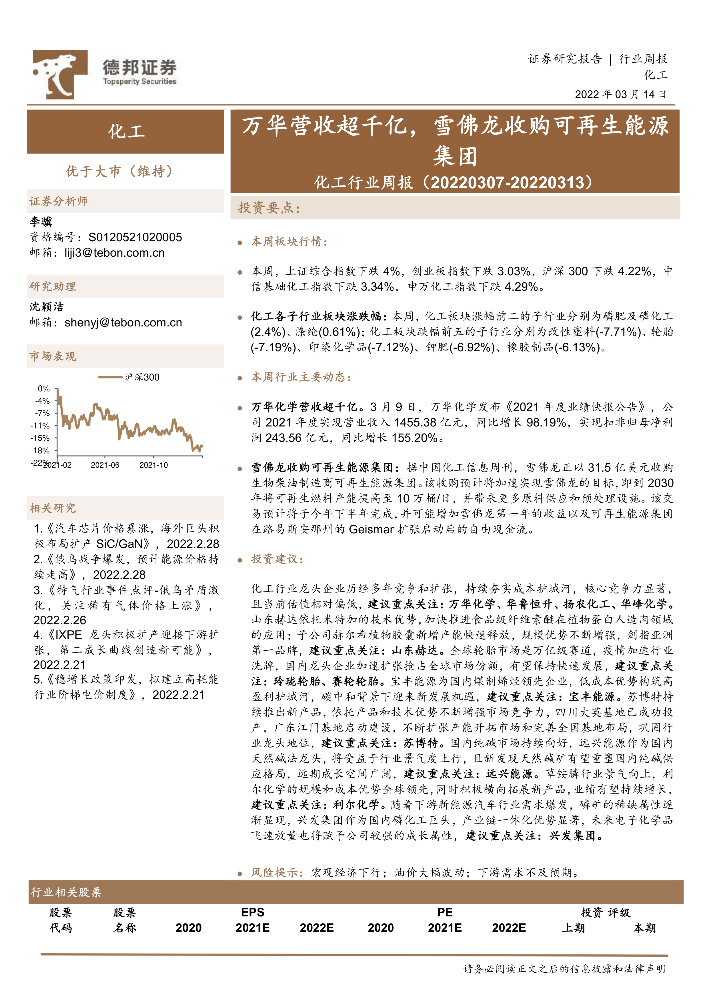 化工行业周报:万华营收超千亿,雪佛龙收购可再生能源集团