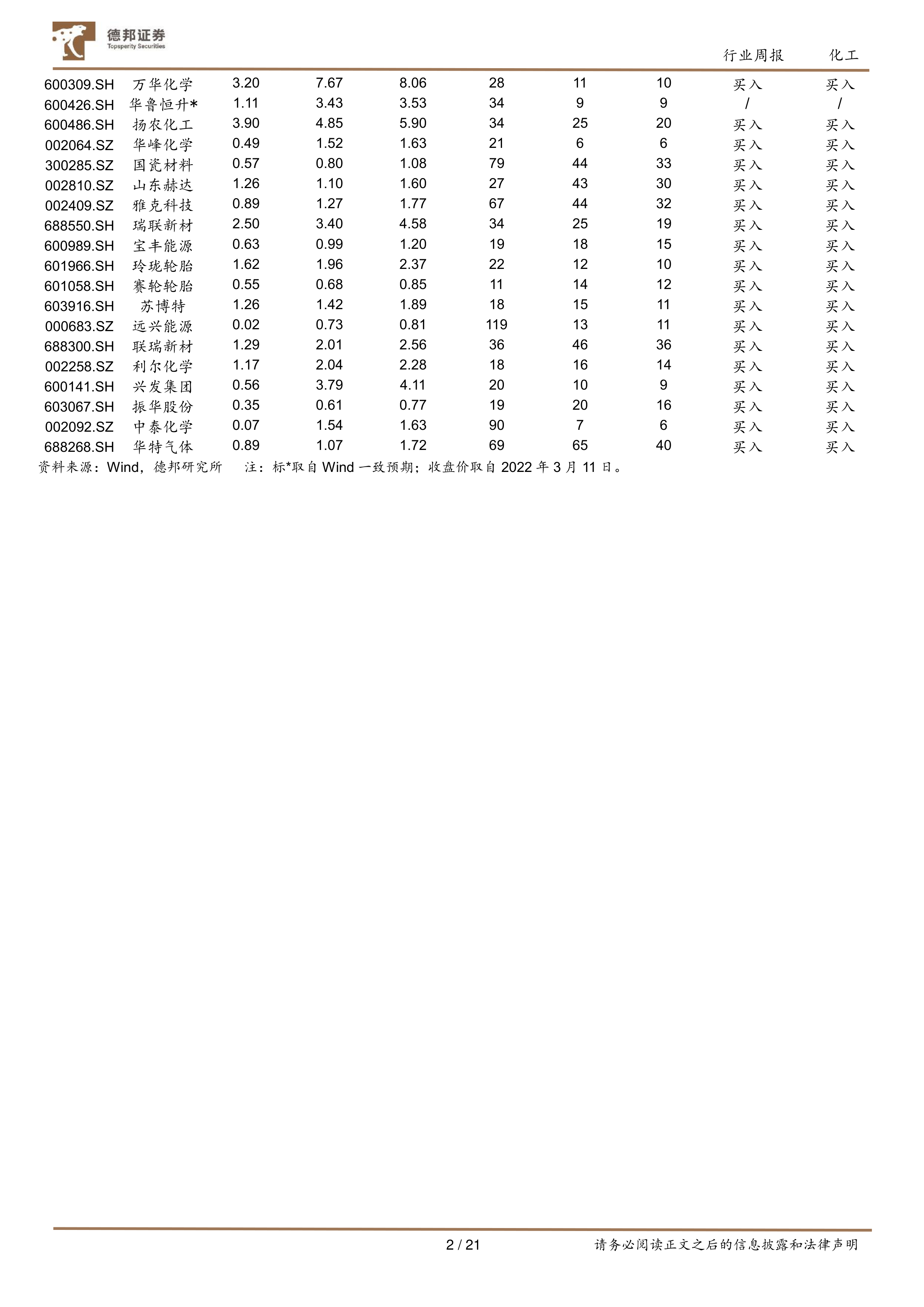 化工行业龙头企业历经多年竞争和扩张,持续夯实成本护城河,核心竞争力显著,且当前估值相对偏低, 建议重点关注:万华化学、华鲁恒升、扬农化工、华峰化学。山东赫达依托米特加的技术优势,加快推进食品级纤维素醚在植物蛋白人造肉领域的应用;子公司赫尔希植物胶囊新增产能快速释放,规模优势不断增强,剑指亚洲第一品牌, 建议重点关注:山东赫达。 全球轮胎市场是万亿级赛道,疫情加速行业洗牌,国内龙头企业加速扩张抢占全球市场份额,有望保持快速发展, 建议重点关注:玲珑轮胎、赛轮轮胎。 宝丰能源为国内煤制烯烃领先企业,低成本优势构筑高盈利护城河,碳中和背景下迎来新发展机遇, 建议重点关注:宝丰能源。 苏博特持续推出新产品,依托产品和技术优势不断增强市场竞争力,四川大英基地已成功投产,广东江门基地启动建设,不断扩张产能开拓市场和完善全国基地布局,巩固行业龙头地位, 建议重点关注:苏博特。 国内纯碱市场持续向好,远兴能源作为国内天然碱法龙头,将受益于行业景气度上行,且新发现天然碱矿有望重塑国内纯碱供应格局,远期成长空间广阔, 建议重点关注:远兴能源。 草铵膦行业景气向上,利尔化学的规模和成本优势全球领先,同时积极横向拓展新产品,业绩有望持续增长,建议重点关注:利尔化学。 随着下游新能源汽车行业需求爆发,磷矿的稀缺属性逐渐显现,兴发集团作为国内磷化工巨头,产业链一体化优势显著,未来电子化学品飞速放量也将赋予公司较强的成长属性, 建议重点关注:兴发集团。
